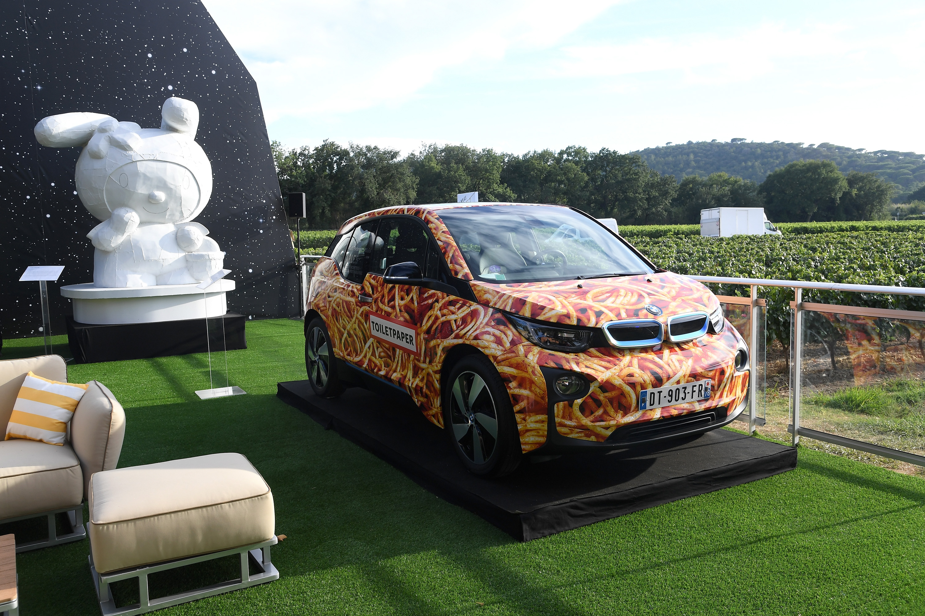BMW i3 “Spaghetti Car” designed by Maurizio Cattelan and Pierpaolo Ferrari at the Fourth Annual Saint-Tropez Gala of the Leonardo DiCaprio Foundation (LDF), July 26, 2017. © Getty Images for Leonardo DiCaprio Foundation (07/2017)