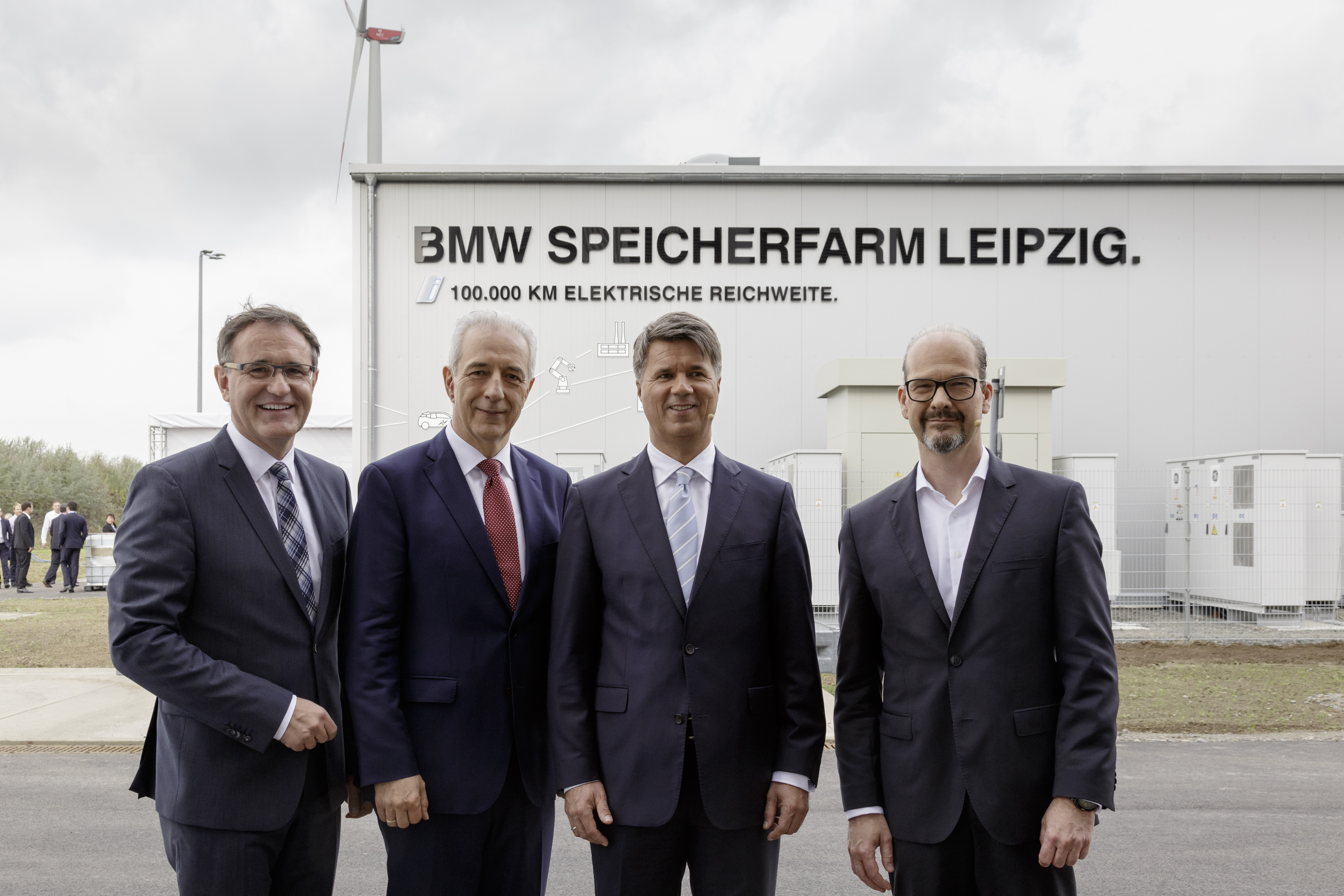 Plant Director Hans-Peter Kemser, CEO Harald Krueger, Prime Minister of Saxony Stanislaw Tillich and Joachim Kolling, Head of BMW Group Energy Services launching the BMW battery Storage Farm Leipzig (10/2017)