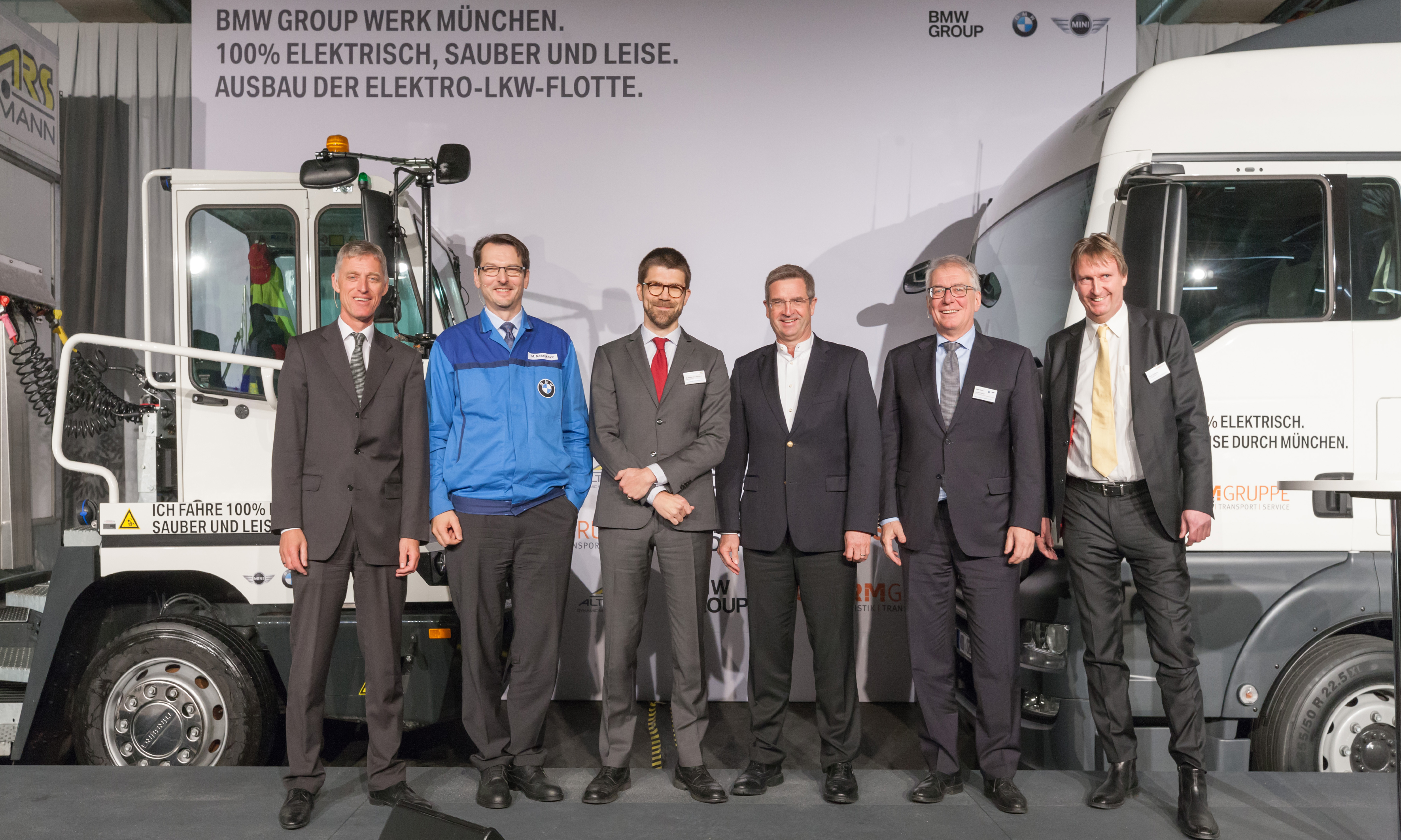 Two additional electric trucks for BMW Group Plant Munich. f.l.t.r. Kurt Kapp; Head of Business development City of Munich; Milan Nedeljkovic, Head of the BMW Group Plant in Munich; Dr. Maximilian Altmann, CEO of ARS Altmann AG; Manfred Schoch, Chairman of the General Works Council of BMW AG; Jürgen Maidl, Head of Logistics at BMW Group; Kurt J.F. Scherm, CEO of the SCHERM Group (12/2017)
