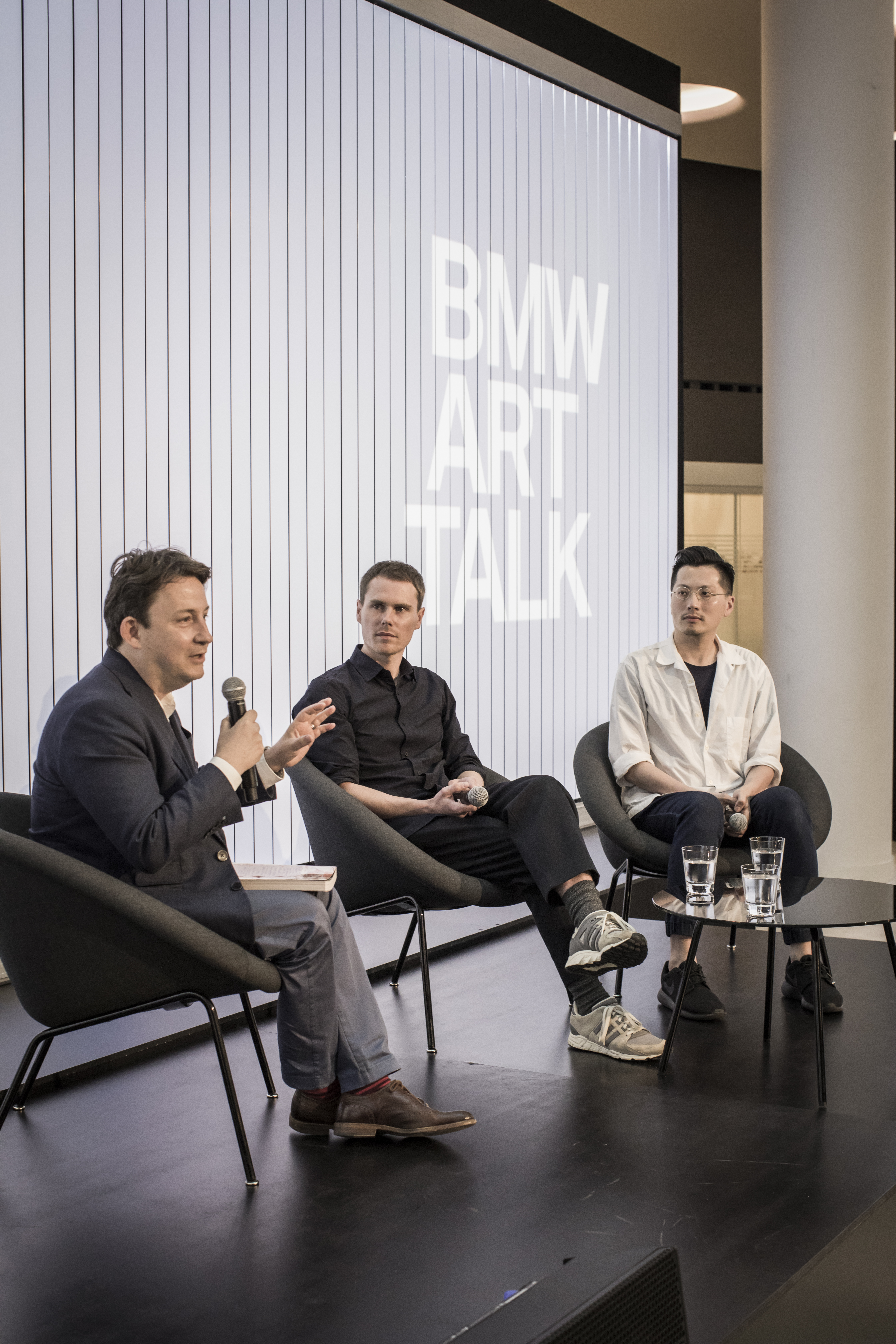 BMW Art Journey Art Talk at UBS Forum June 13, 2018: András Szántó (cultural consultant), Zac Langdon-Pole (artist, winner of the BMW Art Journey from Art Basel Hongkong 2018) and Samson Young (artist, winner of the BMW Art Journey 2015). (c) BMW AG (06/2018)