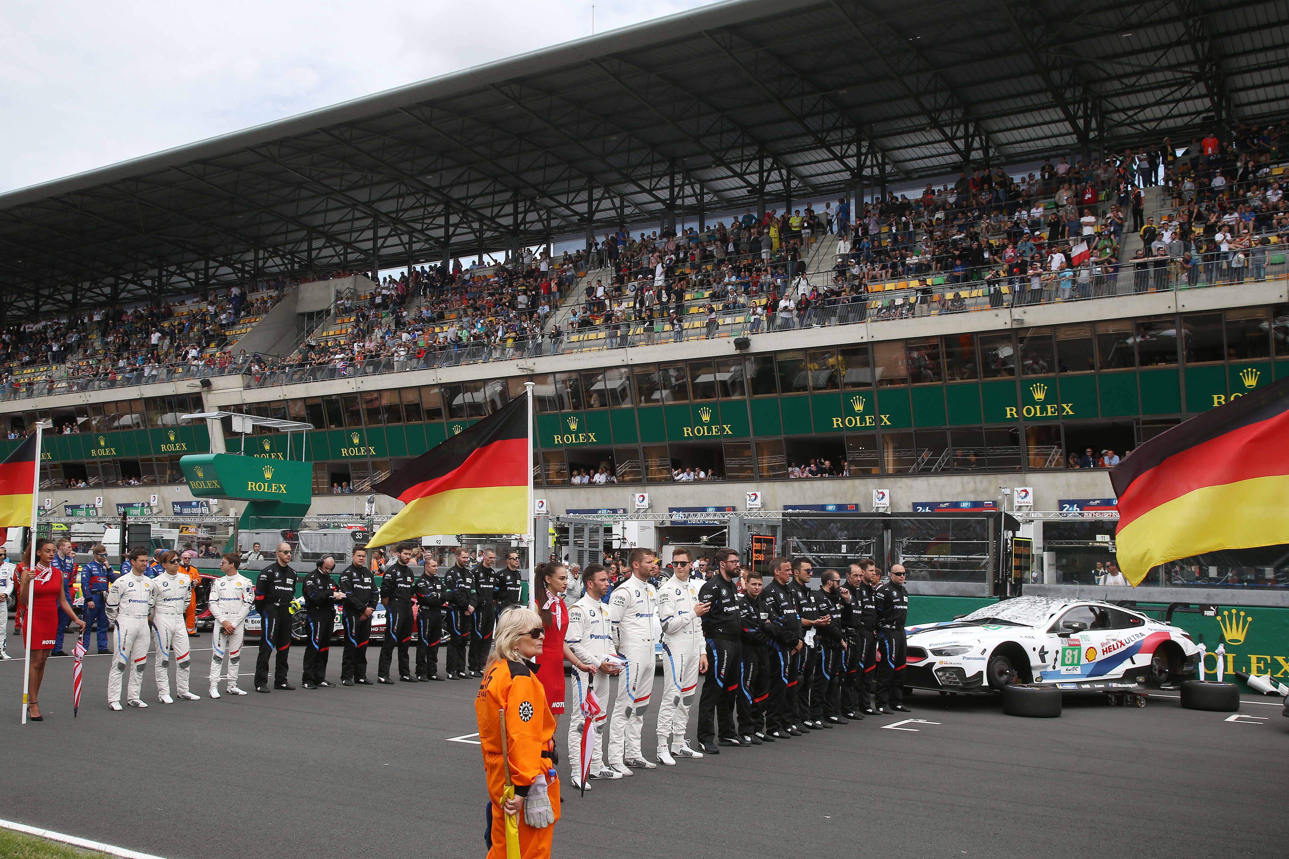 Le Mans (FRA), 16th June 2018. BMW M Motorsport, FIA World Endurance Championship (WEC), 24 Hours of Le Mans, #82 BMW M8 GTE, António Félix da Costa (POR), Alexander Sims (GBR), Augusto Farfus (BRA) and #81 BMW M8 GTE, Martin Tomczyk (GER), Philipp Eng (AUT), Nick Catsburg (NED), starting grid.