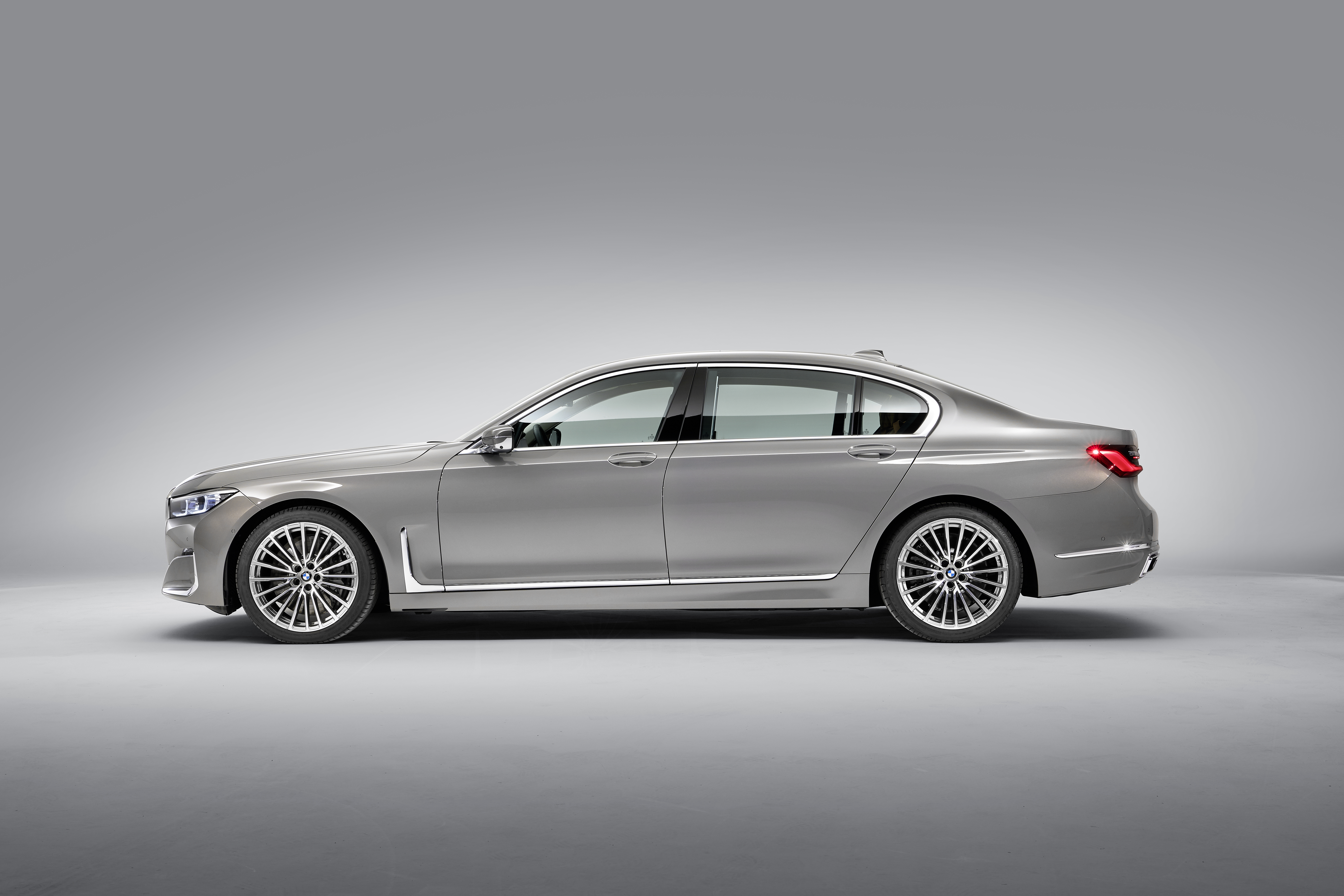 The new BMW 7 Series in painting Bernina Grey Amber Effect metallic with light-alloy wheel Styling 777 and leather “Nappa” with extended quilting in Cognac / Black (01/2019).