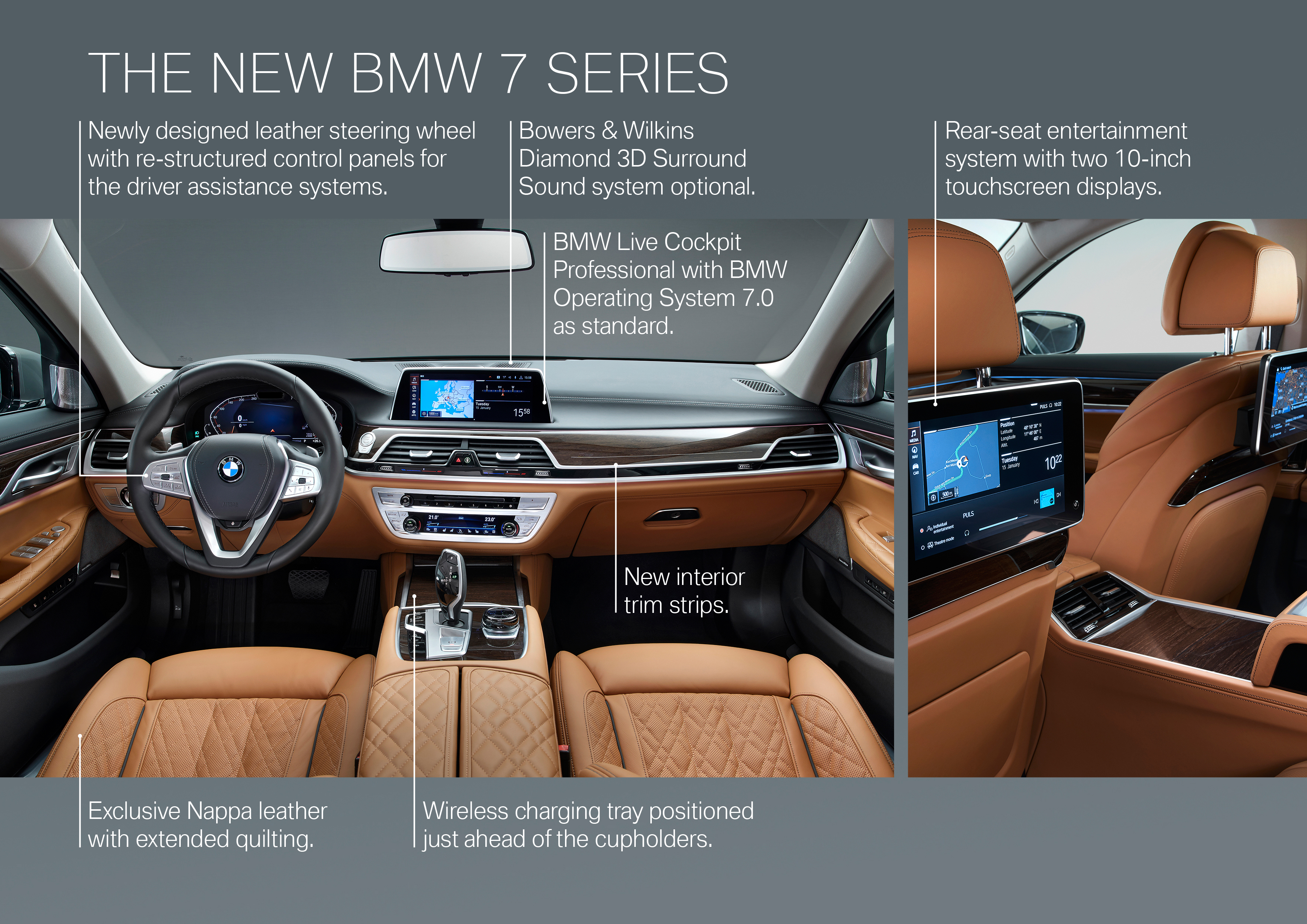 The new BMW 7 Series in painting Bernina Grey Amber Effect metallic with light-alloy wheel Styling 777 and leather “Nappa” with extended quilting in Cognac / Black (01/2019).