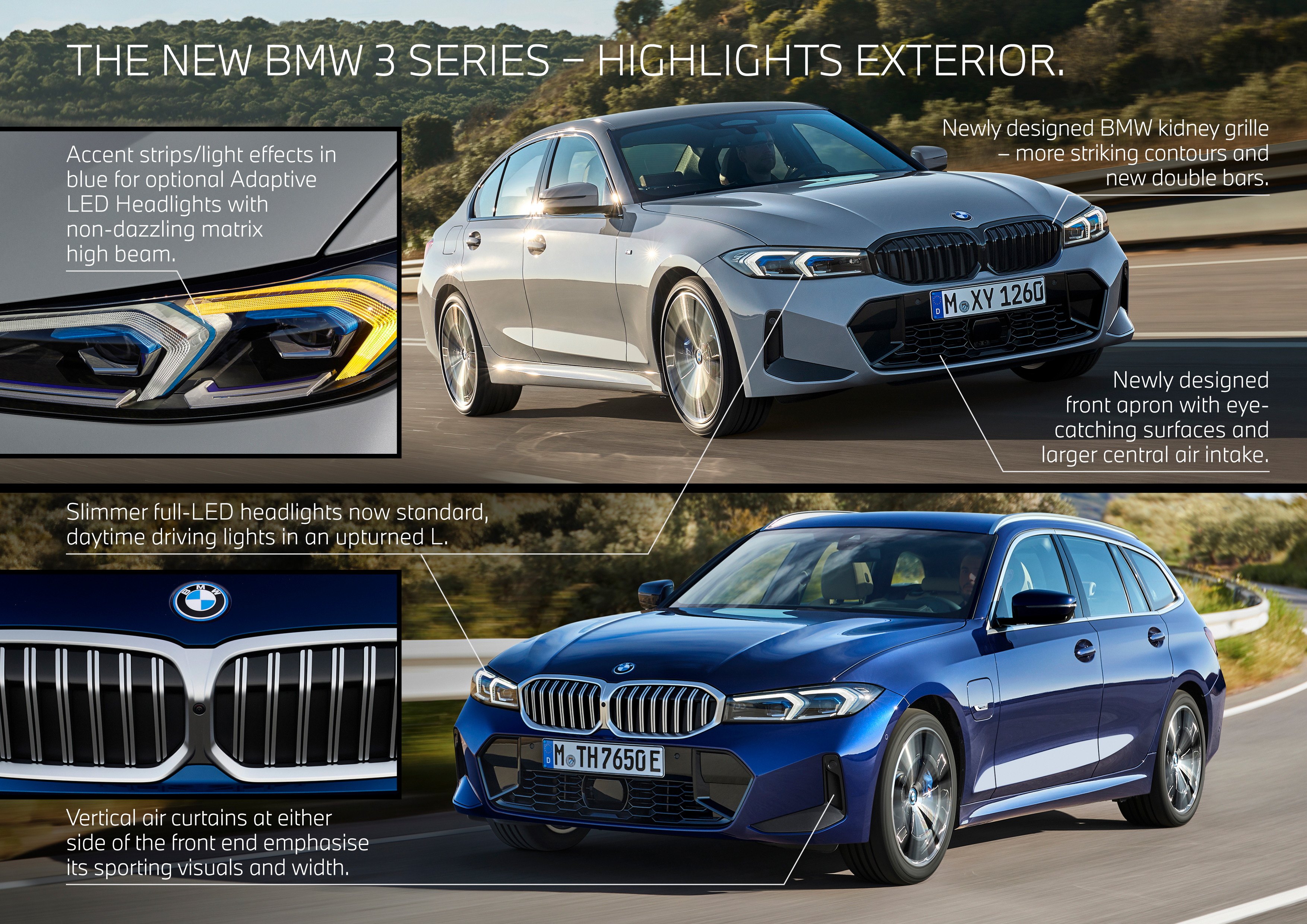 The new BMW 3 Series Sedan, M Brooklyn Grey metallic, Rim 19” Styling 791M bicolor, the new BMW 330e Touring, Tanzanite Blue metallic, Rim 18” Styling ...