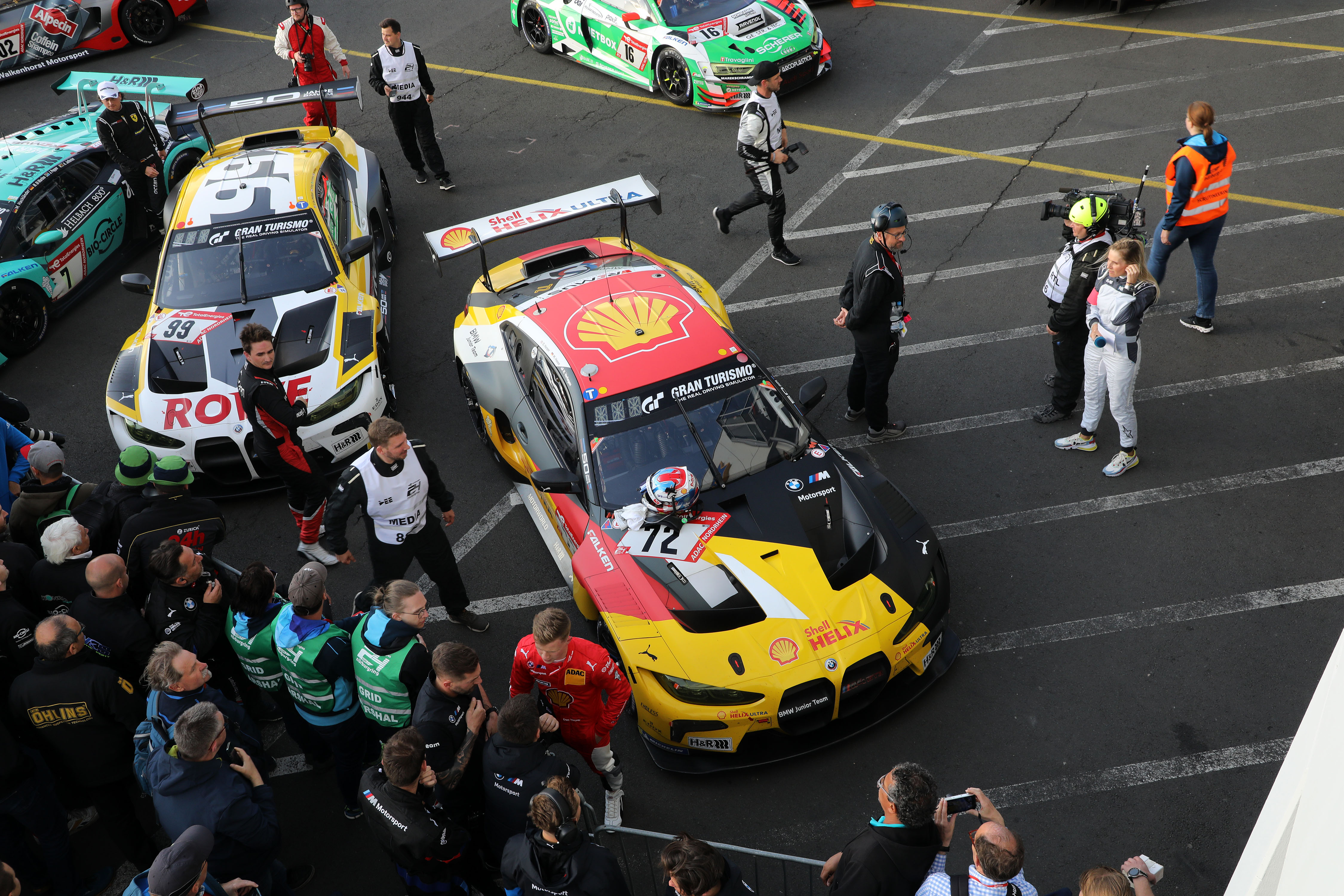 Nürburgring (GER), 26-29 May 2022. 24h Nürburgring, Nordschleife, .#99 BMW M4 GT3, ROWE Racing, Connor De Phillippi, Philipp Eng, Augusto Farfus, Nick Yelloly and #72 BMW M4 GT3, BMW M Team RMG, BMW Junior Team, Dan Harper, Max Hesse, Neil Verhagen.Parc ferme.