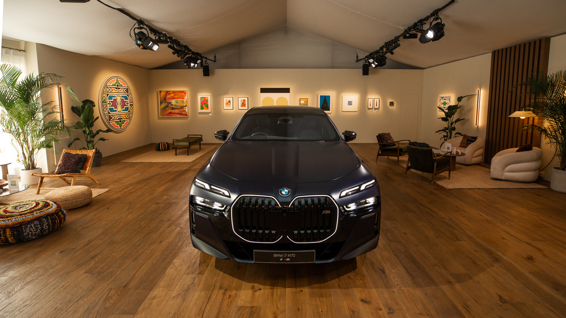 BMW Lounge at Frieze London 2024: Display of Russell Tovey's private art collection in response to Esther Mahlangus works „Ndebele Abstract“ and „Ndebele Abstract 2022“. Photo: Callum Morrison (10/2024)