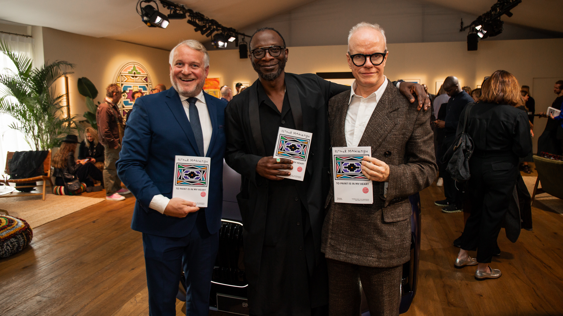 Frieze London 2024: “Esther Mahlangu: To Paint is in My Heart”, published by Thames & Hudson, book signing with co-editors Azu Nwagbogu, Hans Ulrich Obrist and Thomas Girst at the BMW Lounge at Frieze London. Photo: Callum Morrison (10/2024)