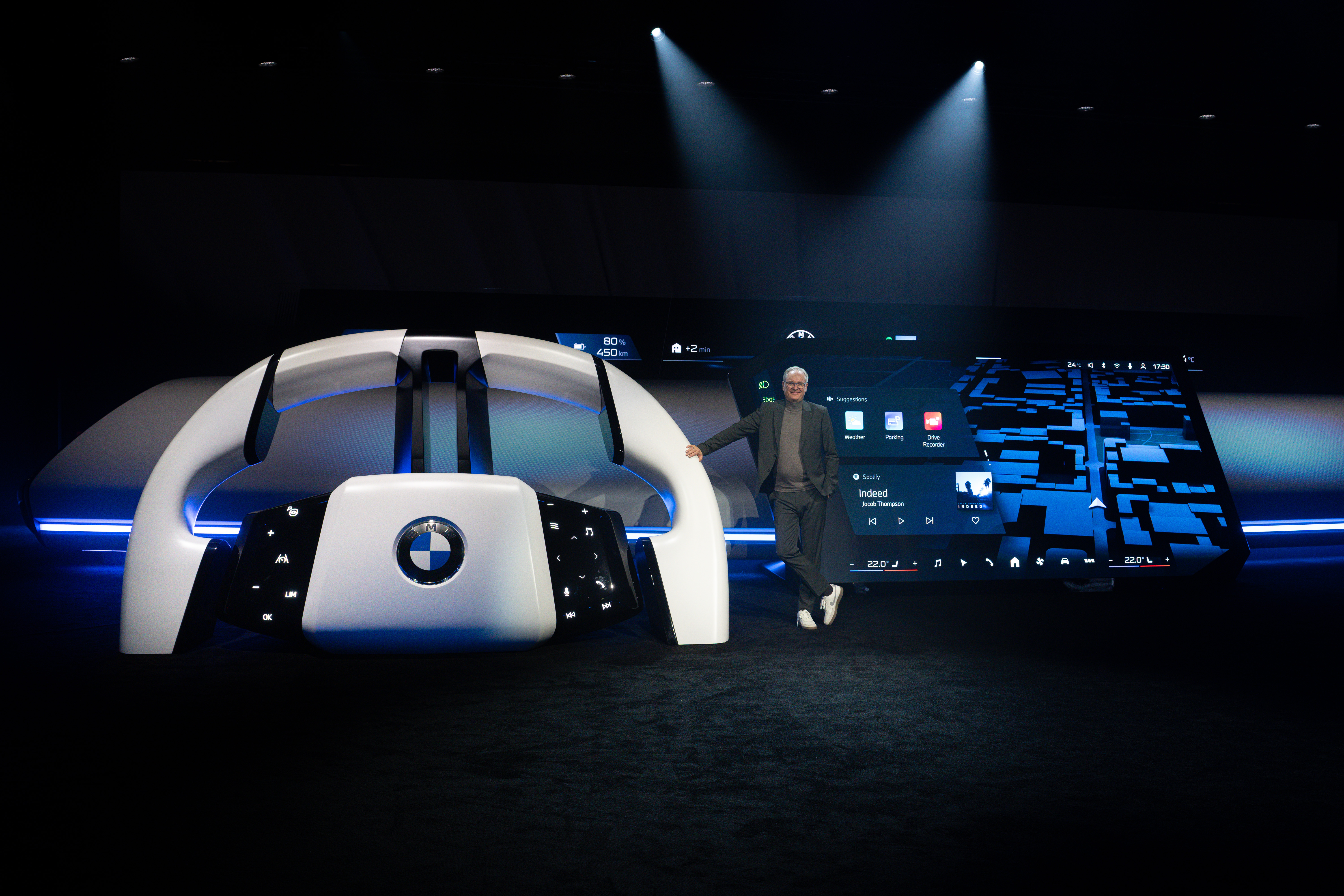 Stephan Durach, Senior Vice President UI/UX Development BMW Group, and the BMW Panoramic iDrive at CES 2025.
