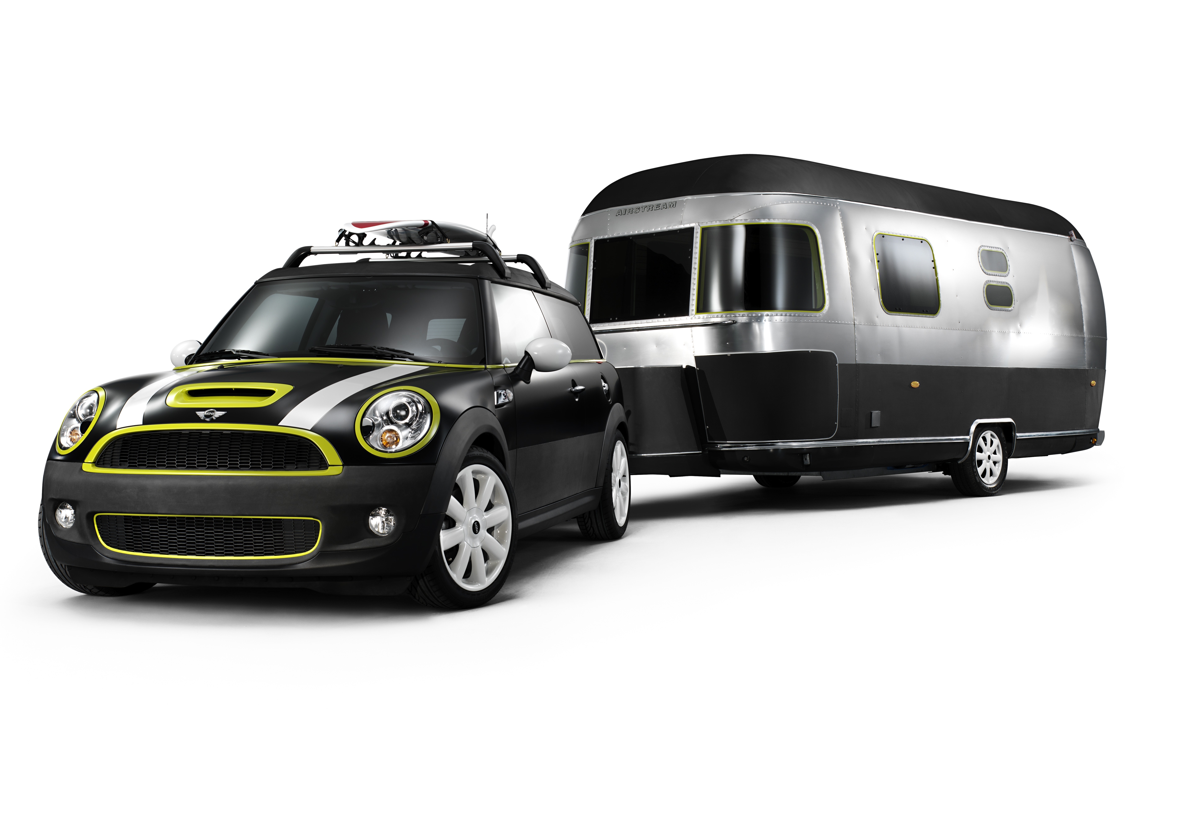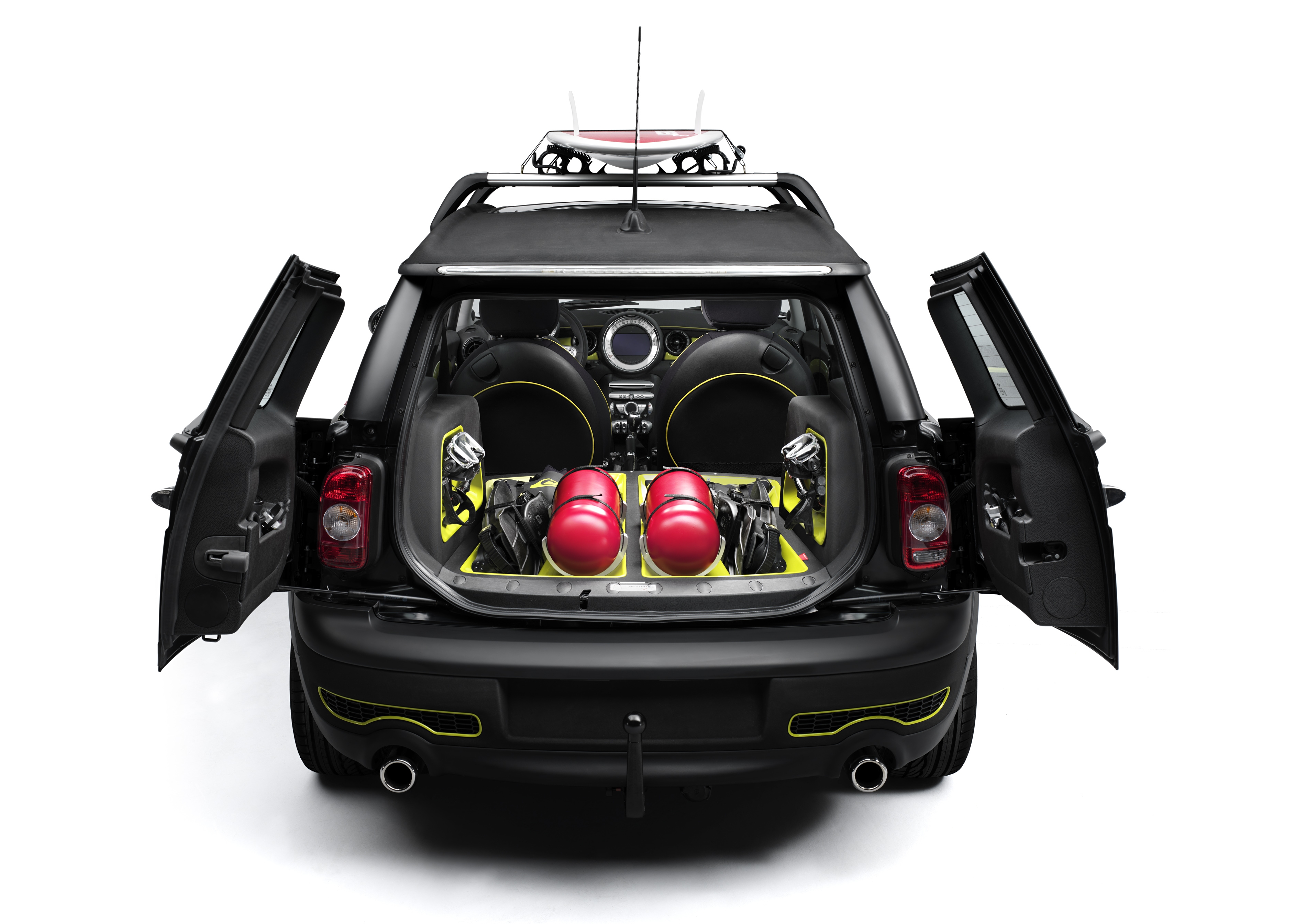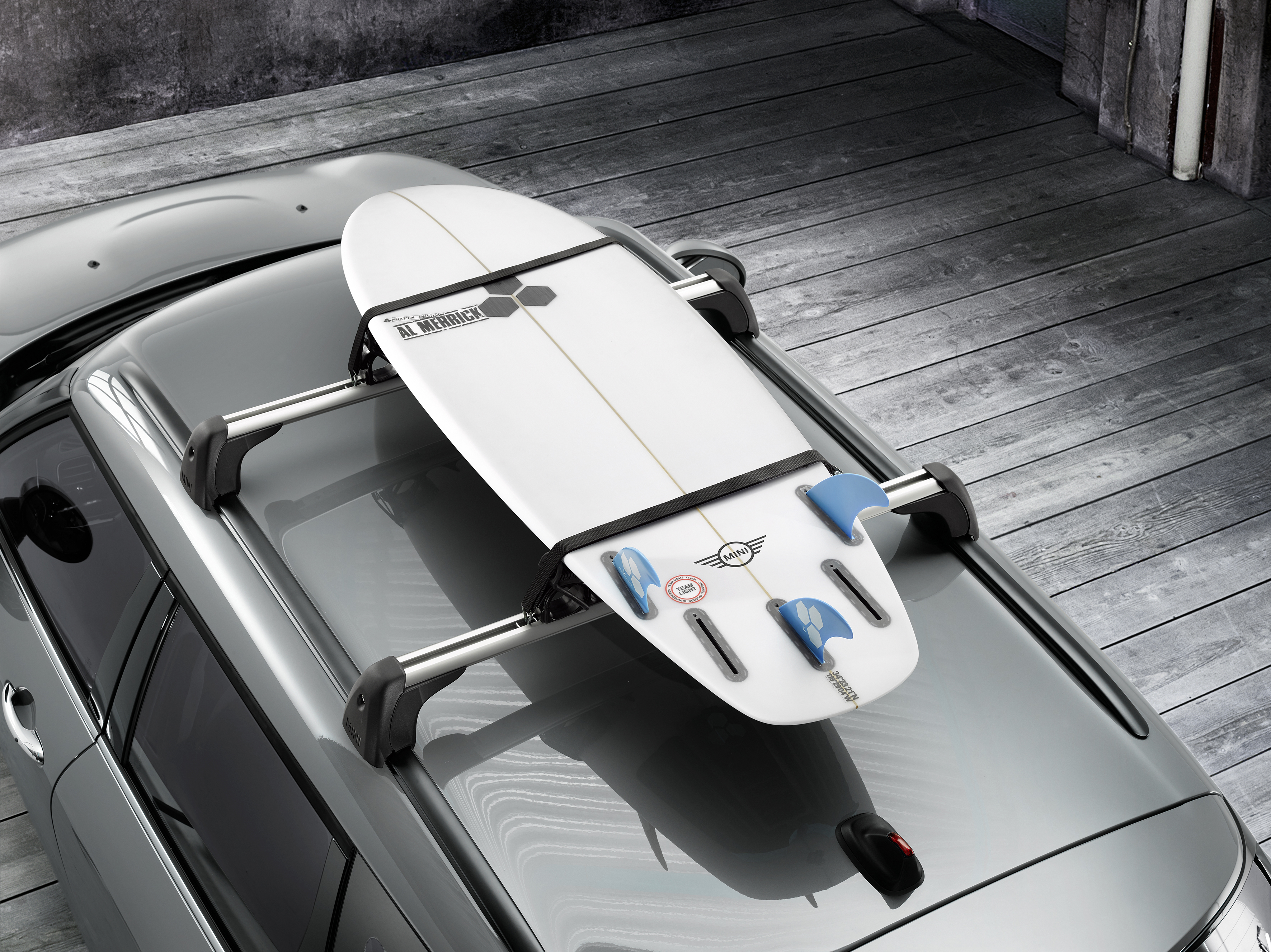 The new MINI Clubman with roof rack base support system for roof rails and surfboard holder. (06/2015)