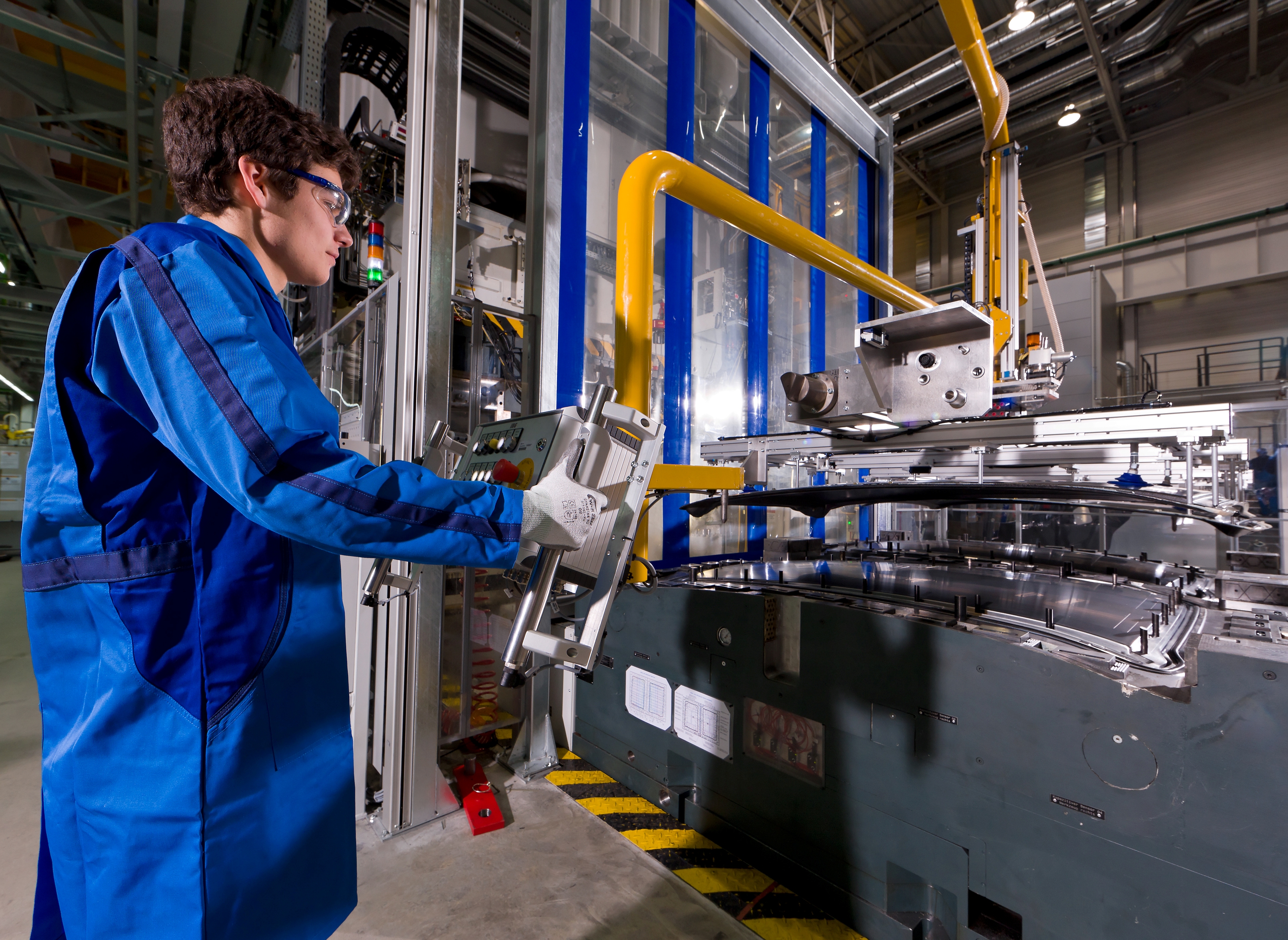 BMW Werk Landshut: neues Innovations- und Produktionszentrum CFK, Mitarbeiter an einer RTM (Resin Transfer Moulding)-Presse für CFK-Bauteile, ...