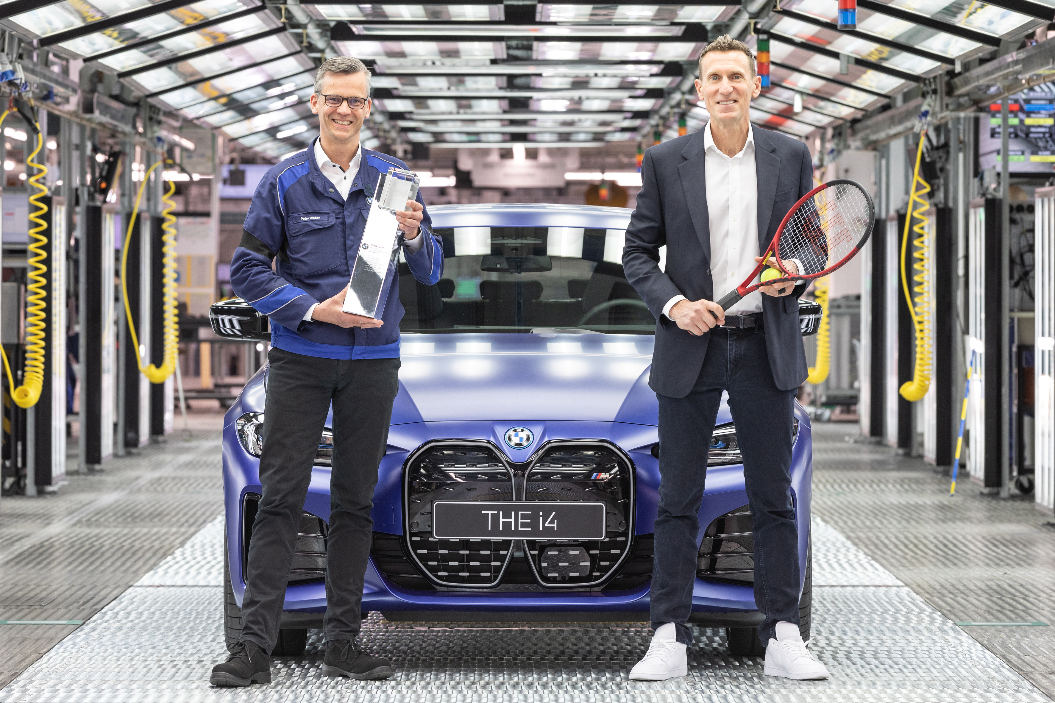 Peter Weber, Leiter BMW Group Werk München; Patrik Kühnen, Turnierdirektor. BMW i4 M50, Siegerfahrzeug der BMW Open by American Express, produziert im ...