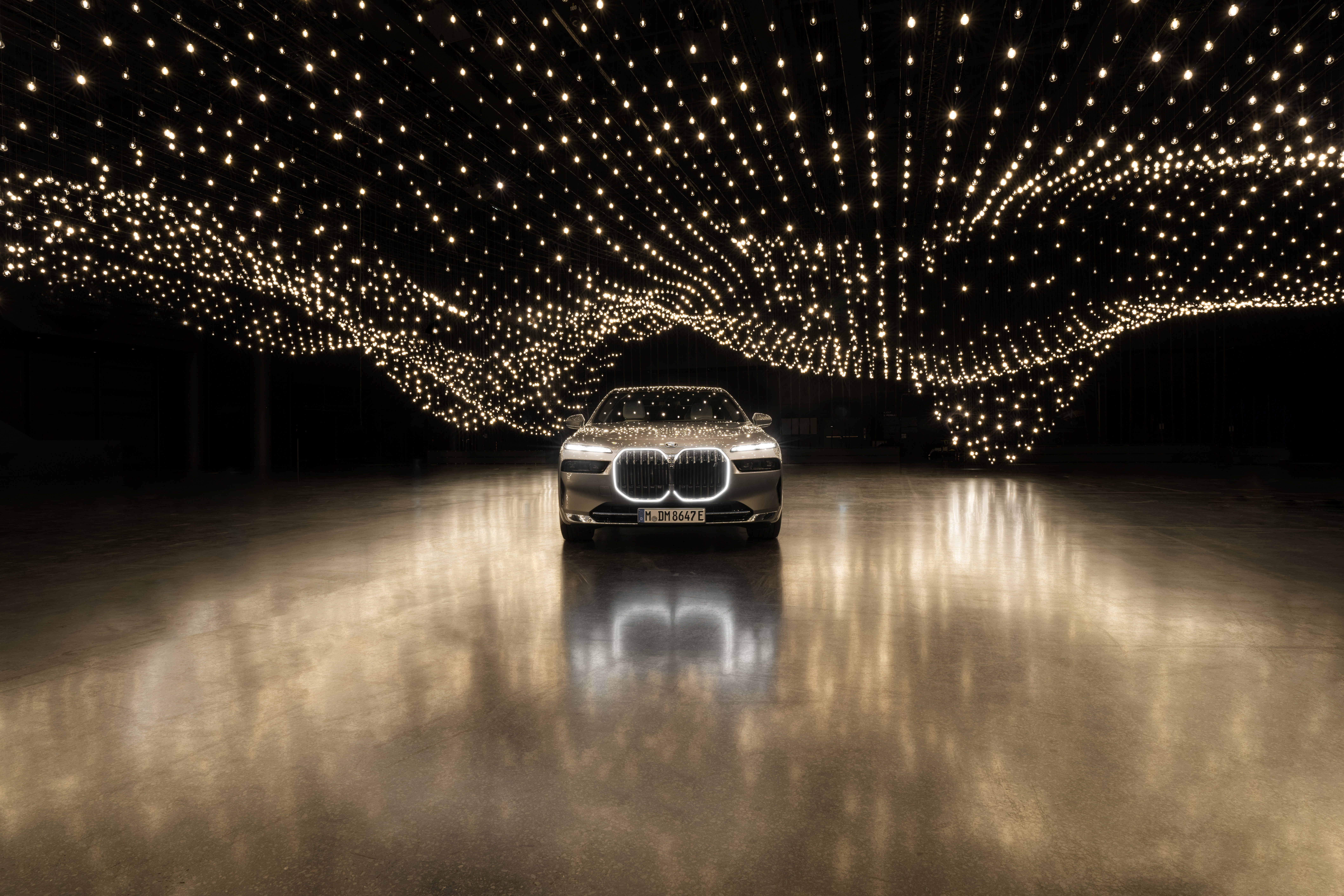 Anlässlich der Art Basel in Basel 2022 präsentieren Superblue und BMW i Rafael Lozano-Hemmer: „Pulse Topology“. Installationsansicht mit dem neuen BMW i7. Foto: Enes Kucevic (06/2022)