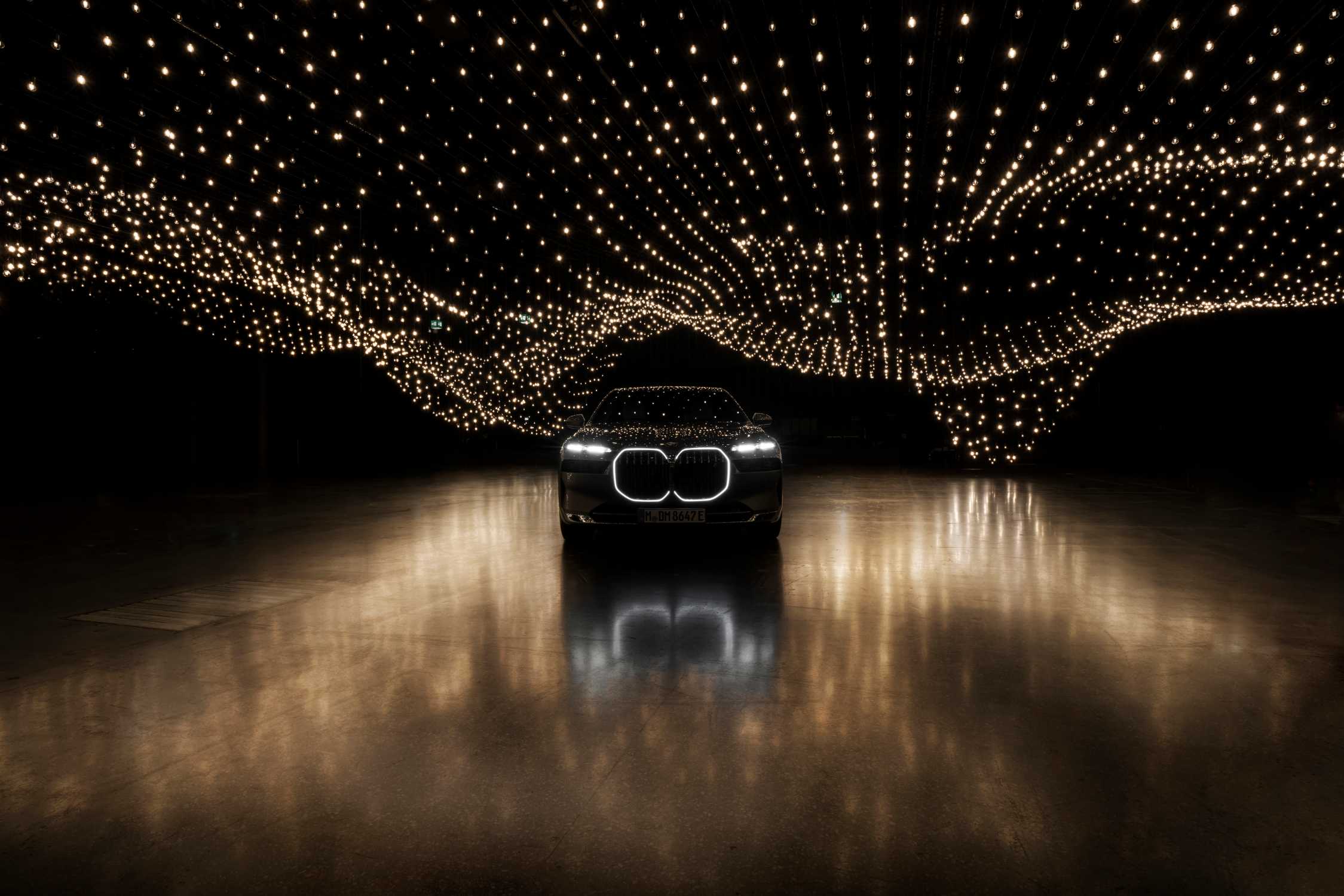 Anlässlich der Art Basel in Basel 2022 präsentieren Superblue und BMW i Rafael Lozano-Hemmer: „Pulse Topology“. Installationsansicht mit dem neuen BMW i7. Foto: Enes Kucevic (06/2022)