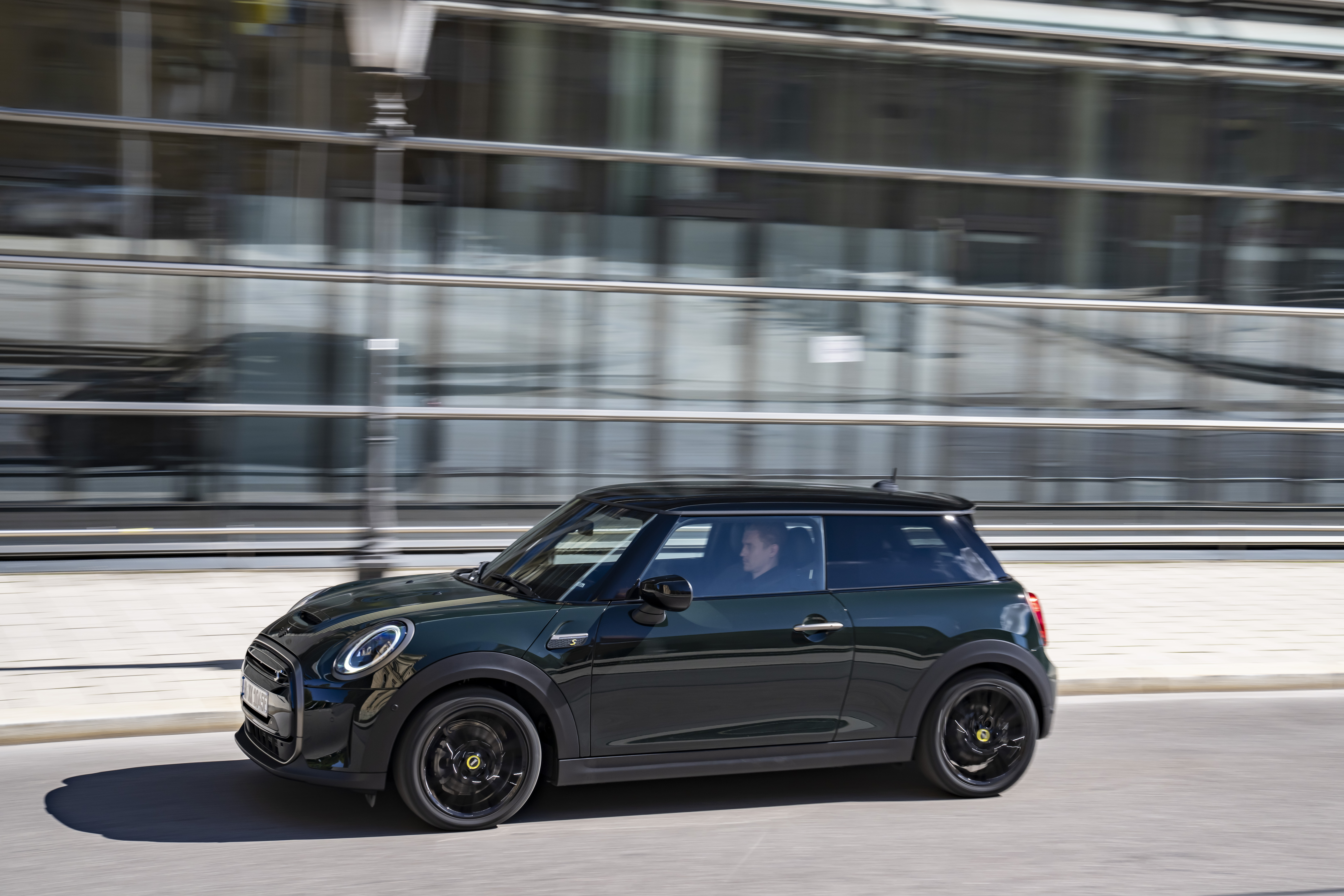 MINI Cooper SE Resolute Edition Rebel Green mit Dach und Spiegelkappen in Schwarz. (10/2022)
