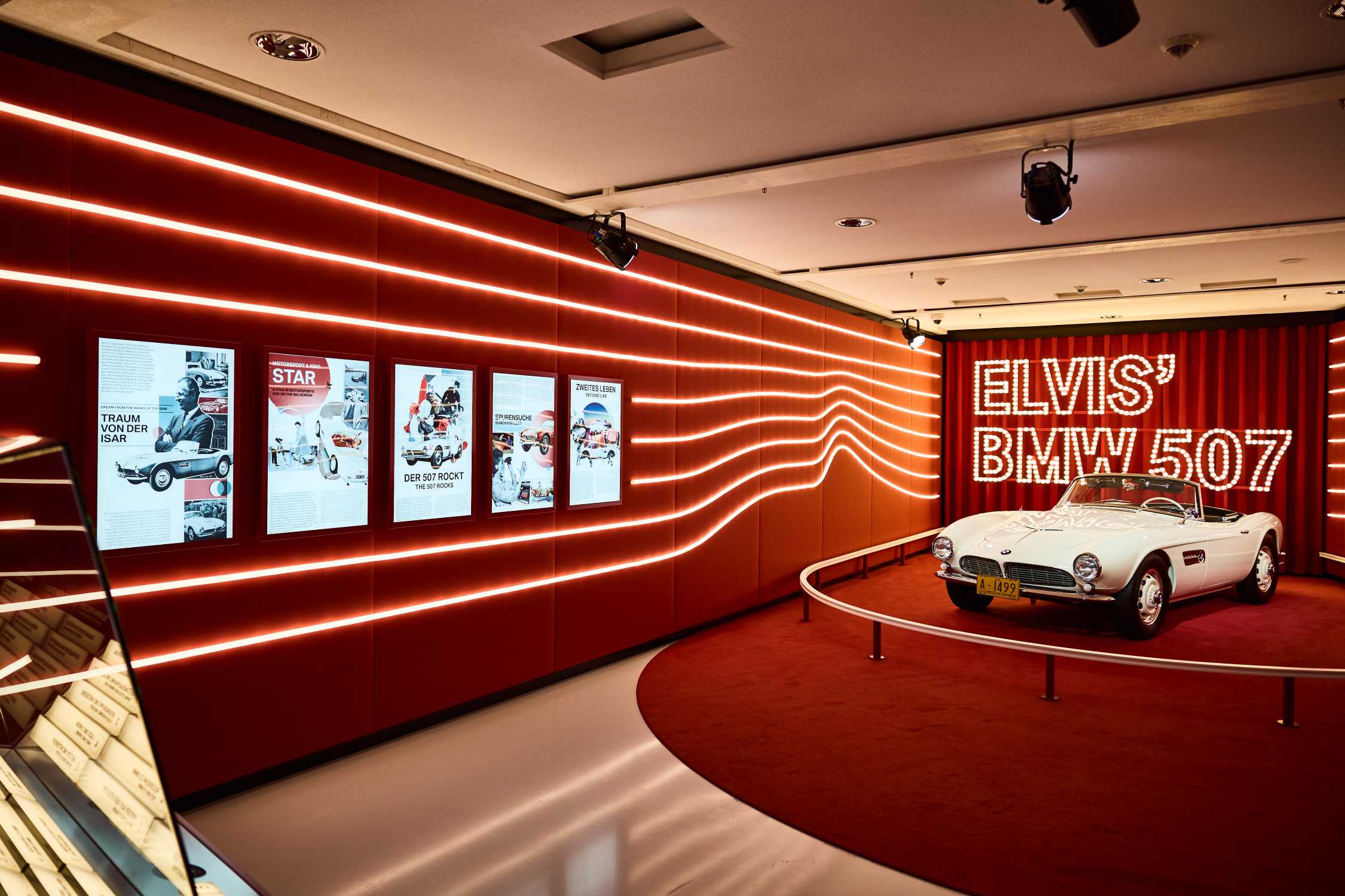 Elvis' BMW 507 auf dem roten Teppich und Retro-Lichtinszenierung fungiert aktuell als Highlight des Hauses der Technik im BMW Museum. (03/2023)