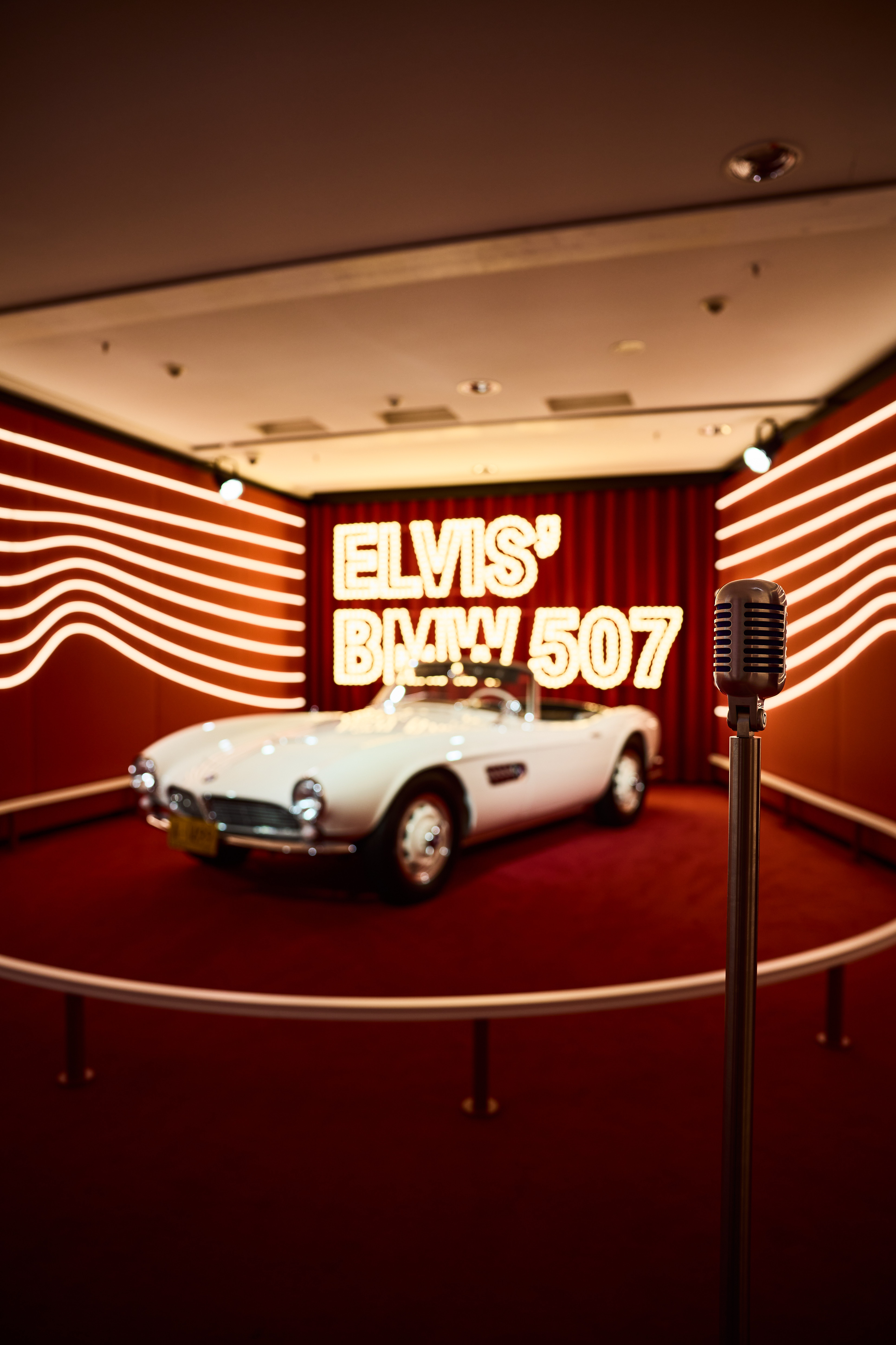 Elvis' BMW 507 ist mit einem Retro-Mikrofon ausgestellt, welches Gästen erlaubt Playback "return to sender" zu singen. (03/2023)