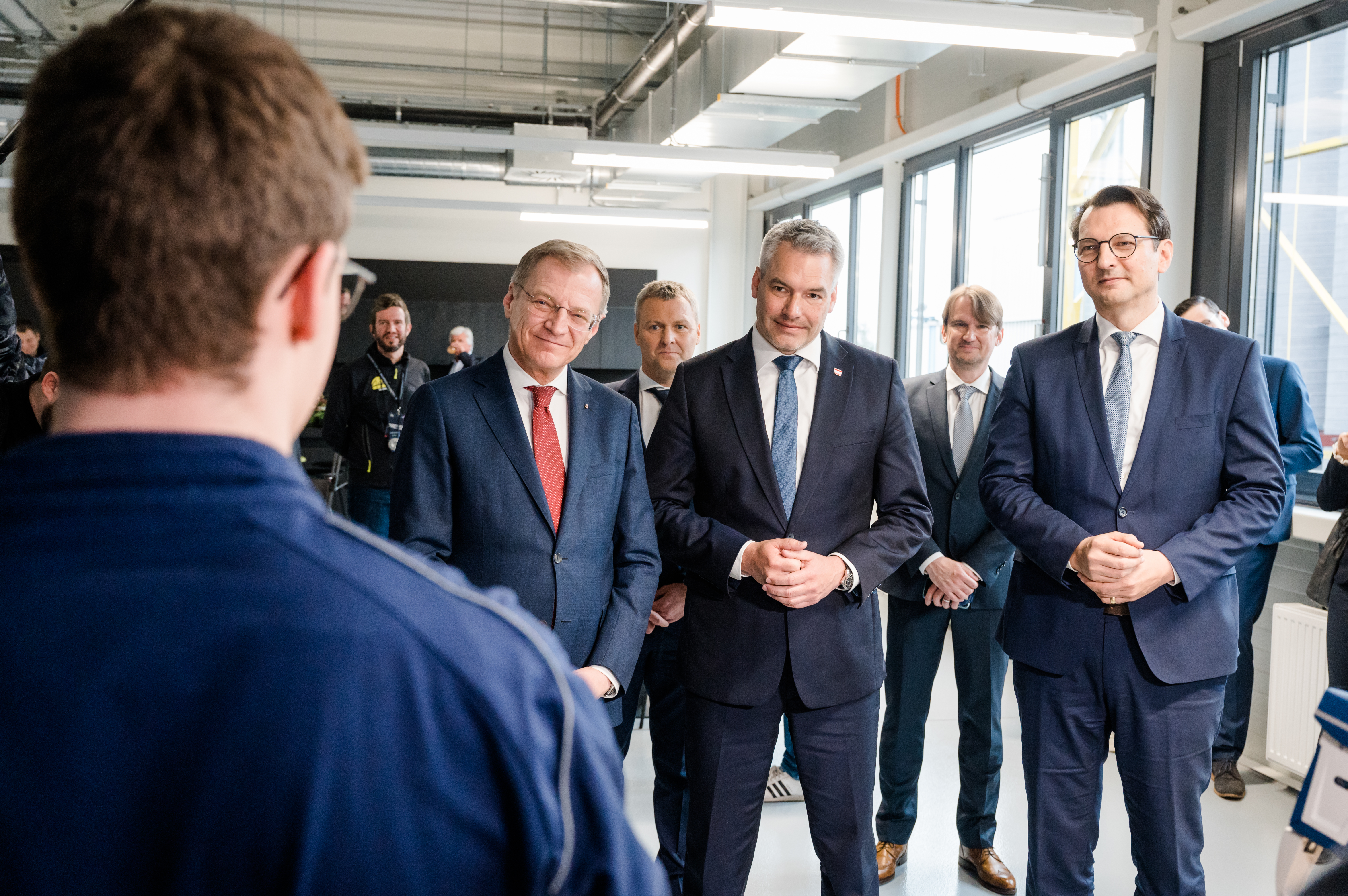 Besuch des österreichischen Bundeskanzler Karl Nehammer im BMW Group Werk Steyr am 18.04.2023, v.l.n.r.: Landeshauptmann Thomas Stelzer, Bundeskanzler Karl Nehammer, Produktionsvorstand der BMW AG Milan Nedeljković (04/2023)