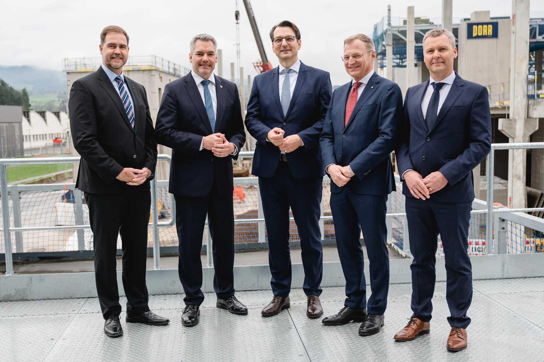 Besuch des österreichischen Bundeskanzler Karl Nehammer im BMW Group Werk Steyr am 18.04.2023, v.l.n.r.: Klaus von Moltke, Geschäftsführer BMW Group Werk Steyr; Bundeskanzler Karl Nehammer; Produktionsvorstand der BMW AG Milan Nedeljković; Landeshauptmann von Oberösterreich Thomas Stelzer; Entwicklungsleiter BMW Standort Steyr, Josef Honeder (04/2023)