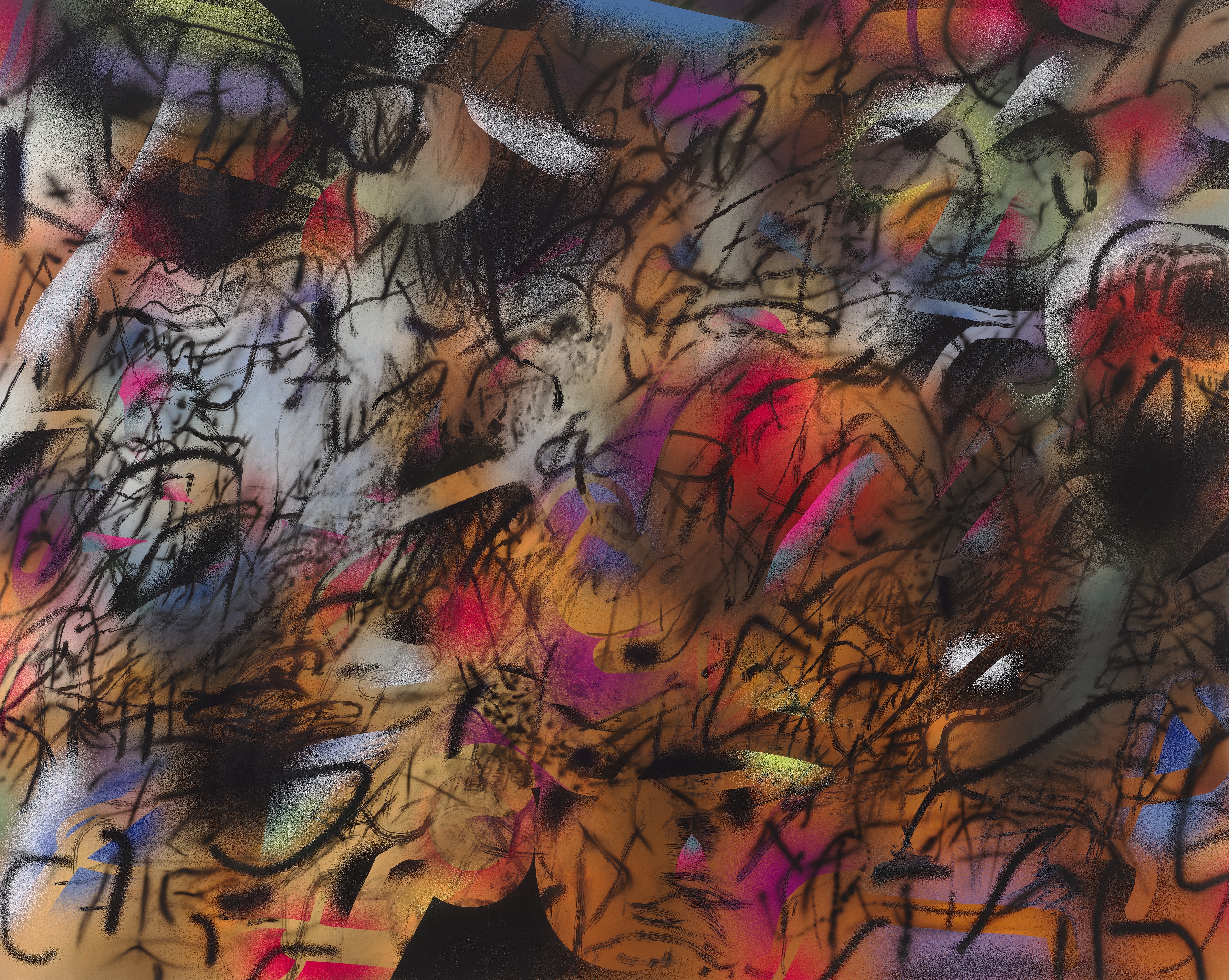 Julie Mehretu Metoikos (she opened her mouth, to breathe lightning), 2019-2021 Ink and Acrylic on Canvas 96 x 120 inches (243.8 x 304.8 cm) Photo Credit: Tom Powel Imaging Private Collection Courtesy of Marian Goodman Gallery © Julie Mehretu (06/2023)