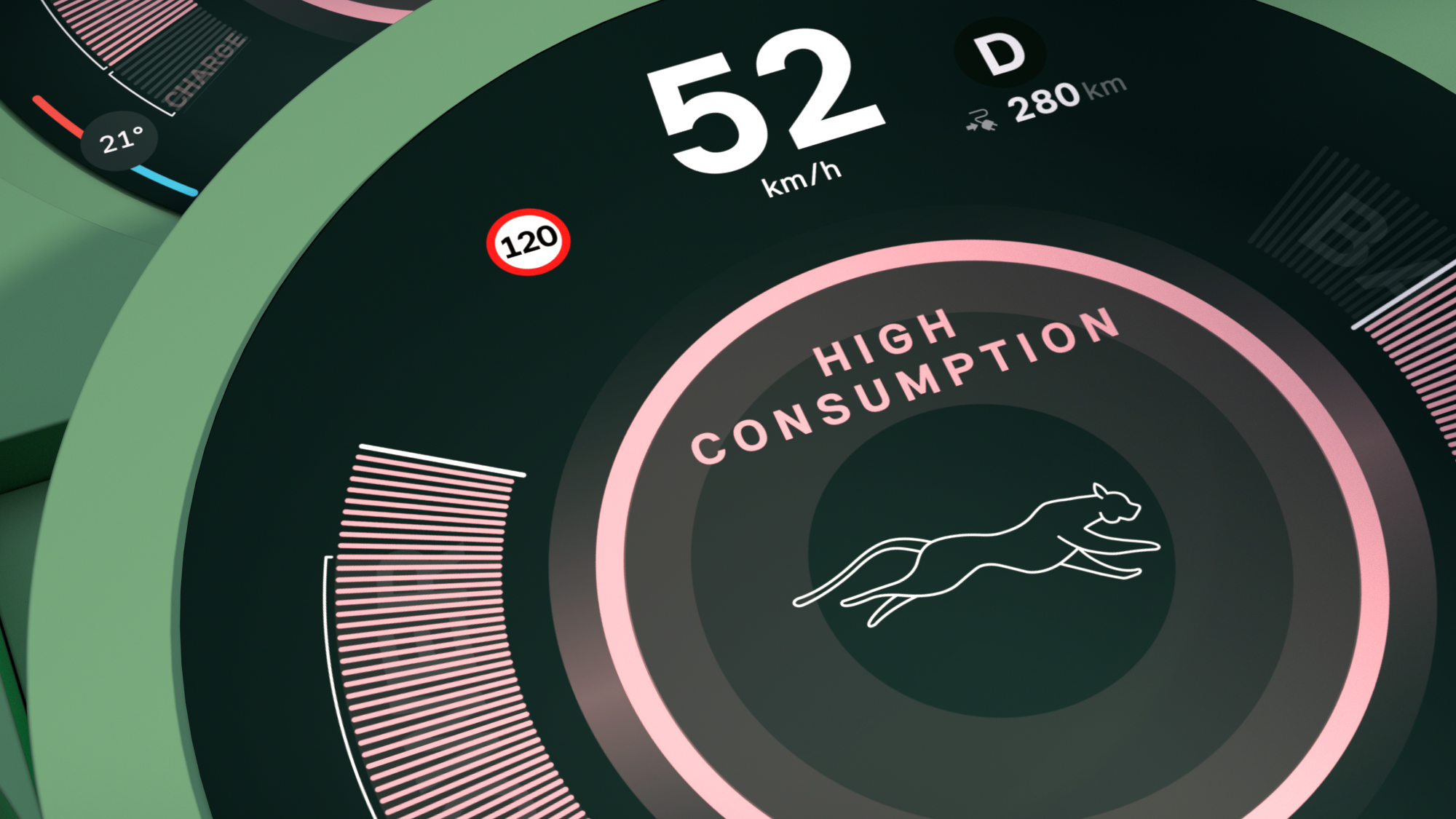 MINI Experience Mode Green. *Die abgebildeten Bildschirmdesigns können bei Serienfahrzeugen unterschiedlich sein. Fahrzeugbezogene Werte sind beispielhaft und können bei Serienfahrzeugen abweichen. Die Verfügbarkeit der Funktionen hängt vom Fahrzeugmodell, der Sonderausstattung und dem Land ab.