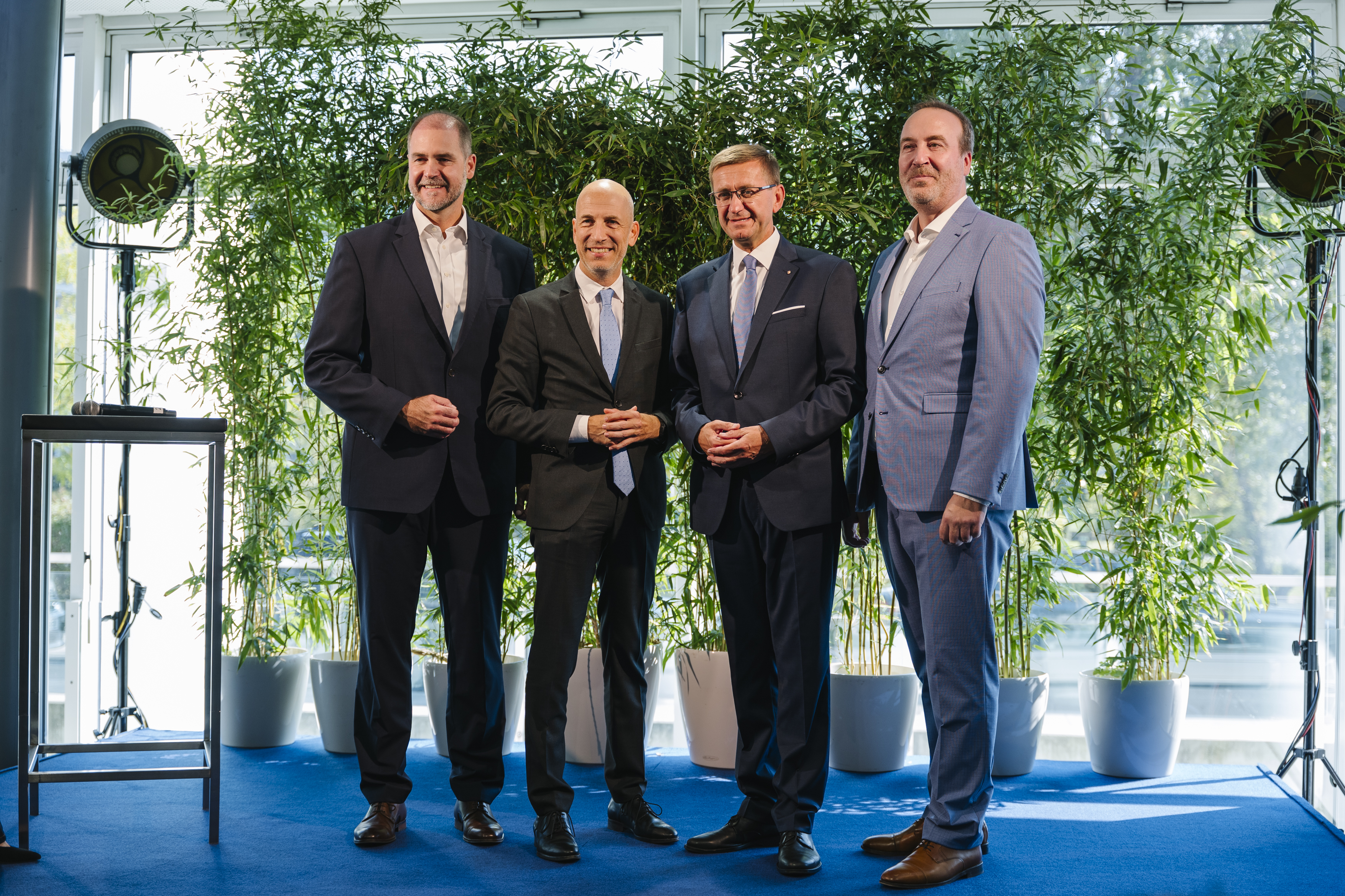 von links nach rechts: Klaus von Moltke, Geschäftsführer BMW Group Werk Steyr; Bundesminister Martin Kocher; Wirtschafts- und Forschungs-Landesrat Markus Achleitner; Christian Morawa, CEO BMW Austria GmbH (09/2023)