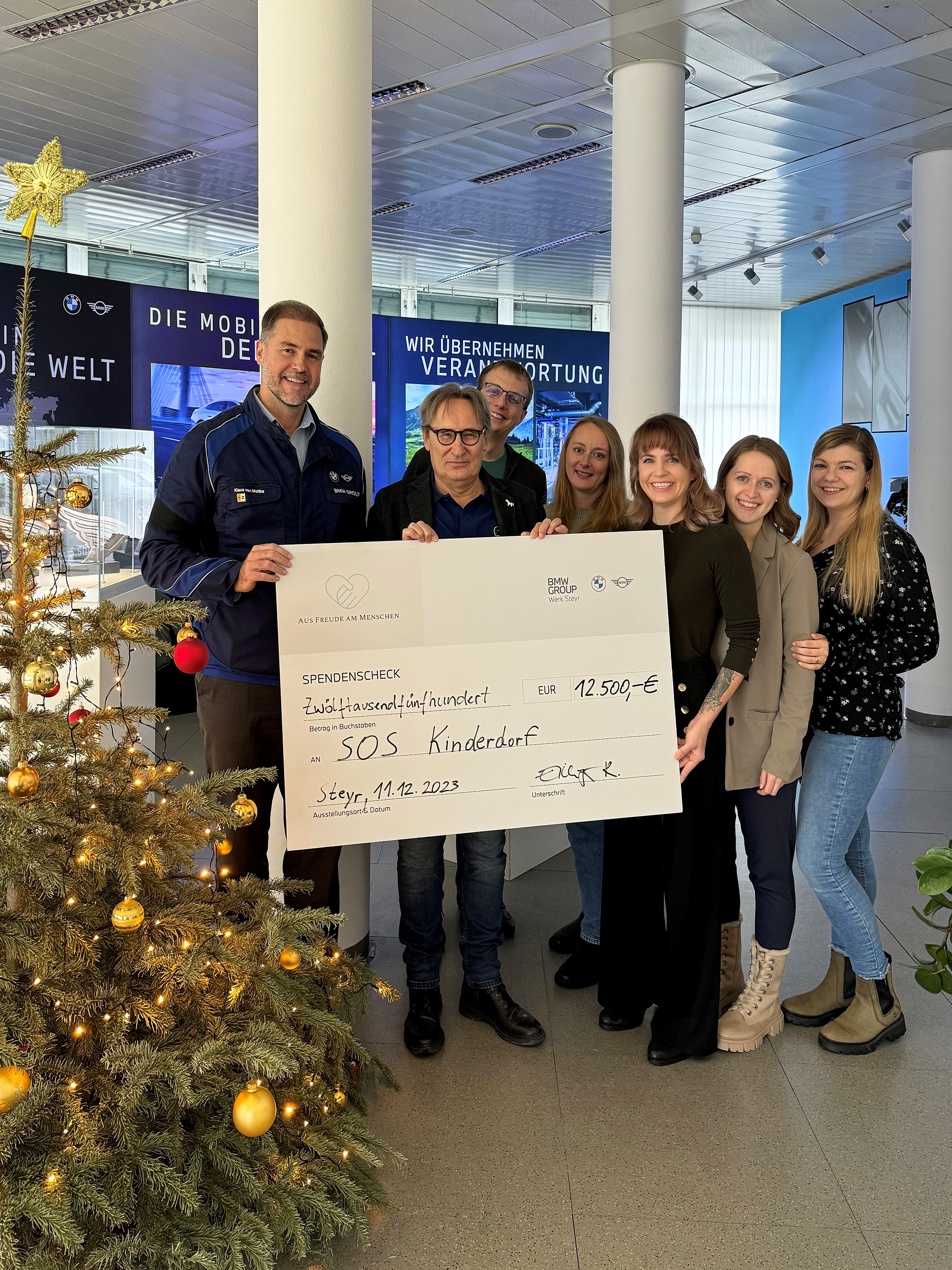 Mitglieder des Charity-Vereins und Werksleiter Klaus von Moltke spenden EUR 12.500 an SOS Kinderdorf. (12/2023)
