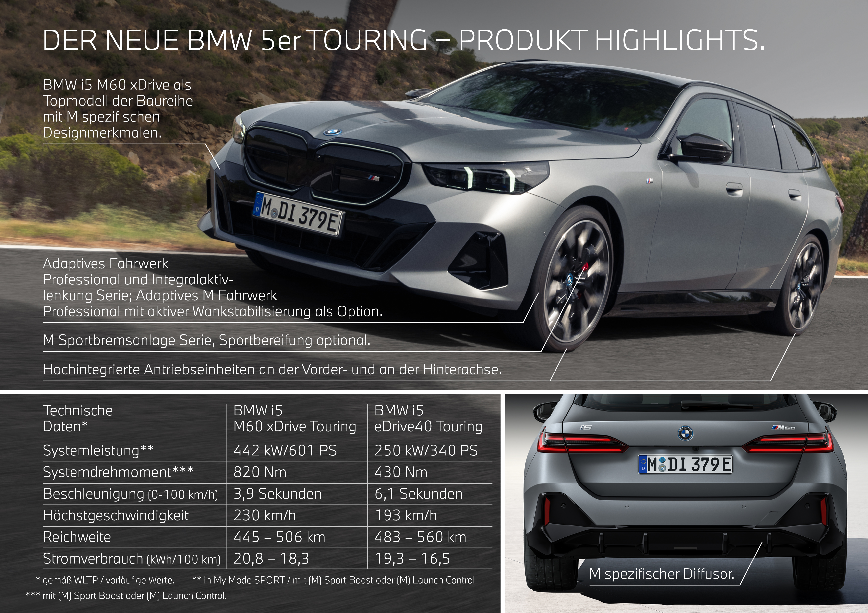 BMW i5 M60 xDrive Touring*: Verbrauch kombiniert gemäß WLTP: 20,8 – 18,3 kWh/100 km, Reichweite: 445 – 506 km gemäß WLTP *Bei allen Verbrauchs- und Emissionswerten handelt es sich um vorläufige Angaben.