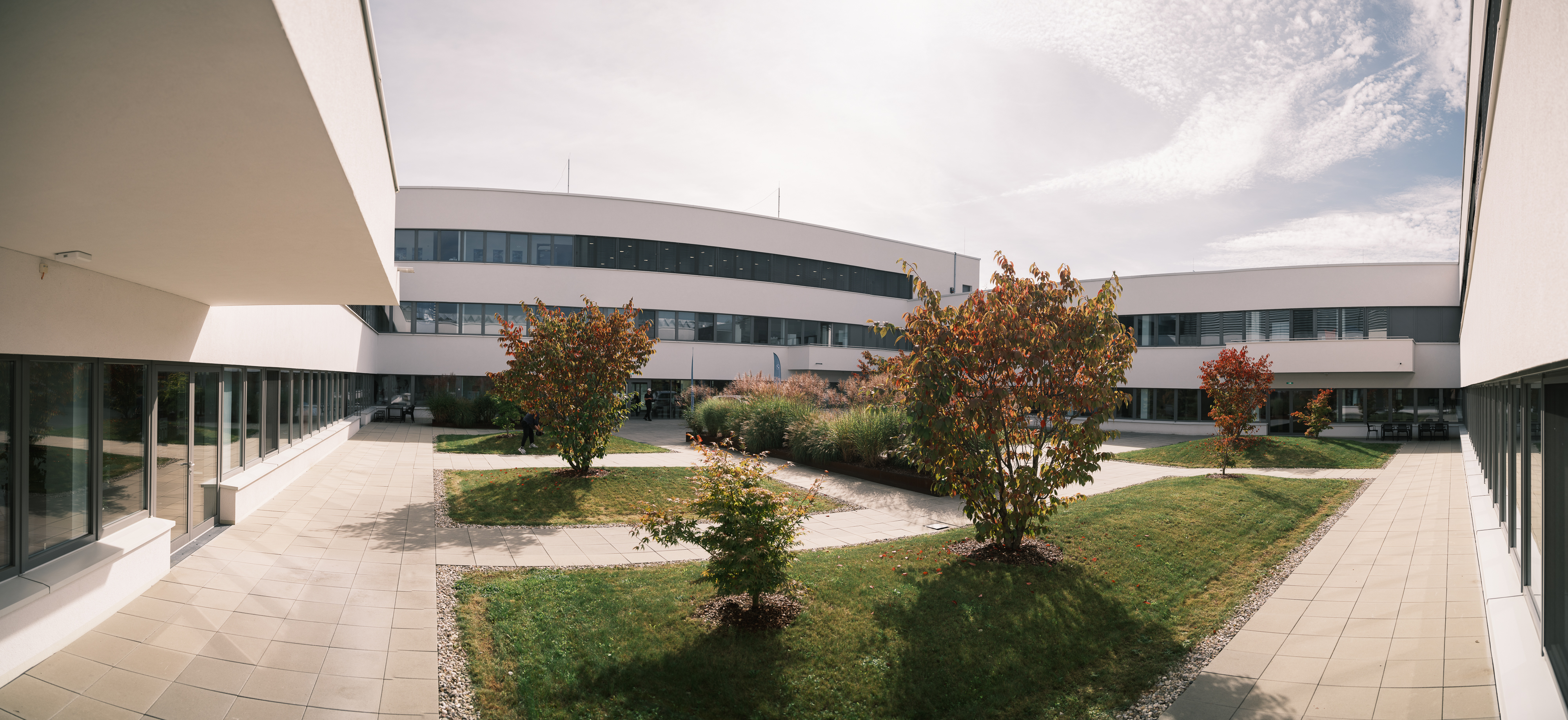 Luftaufnahme des Montagewerks für Hochvoltbatterien Irlbach-Straßkirchen mit Energiezentrale und Feuerwehrgebäude im Vordergrund. (10/2025)