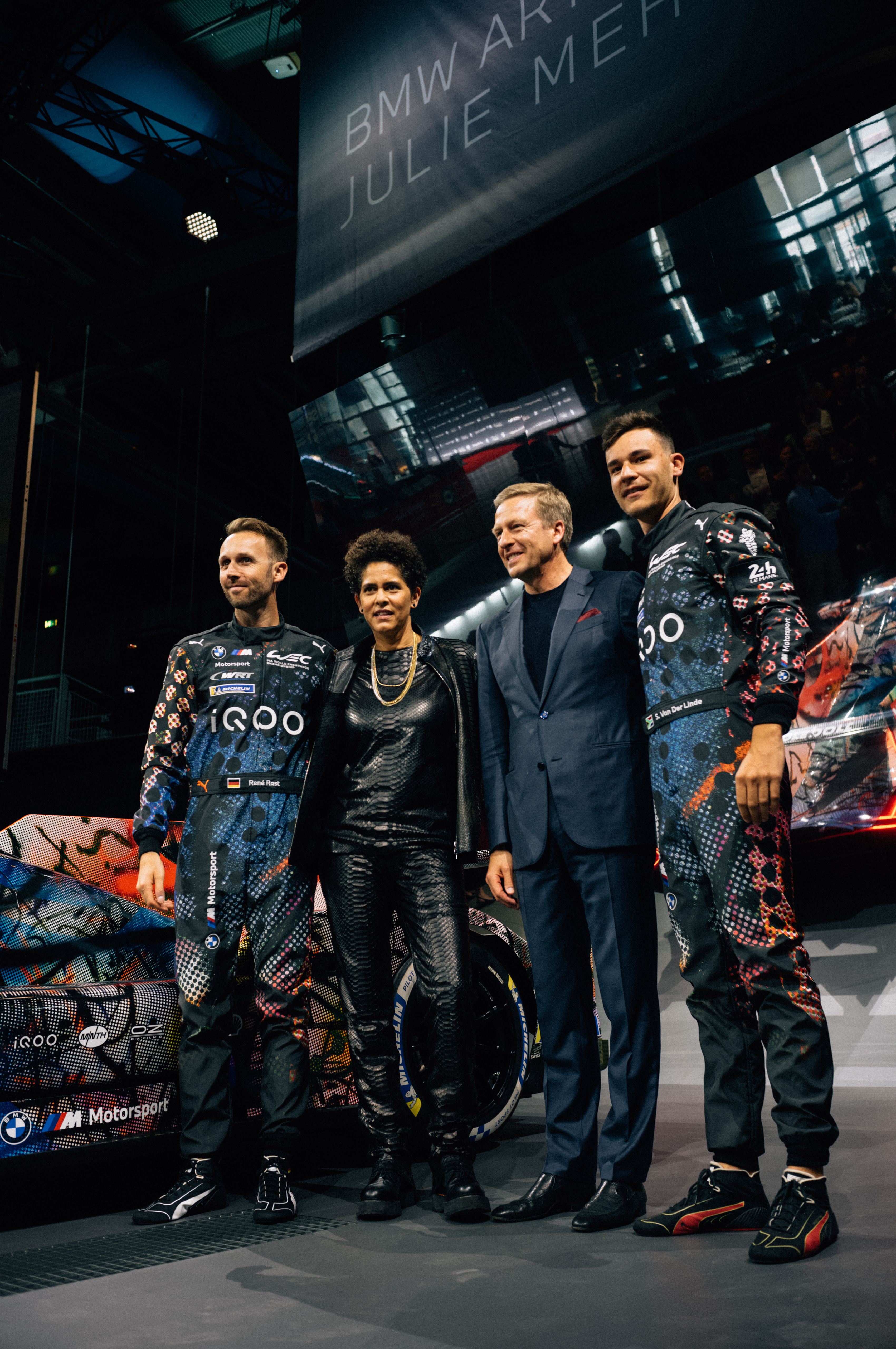 Weltpremiere des BMW Art Car #20 von Julie Mehretu, Centre Pompidou, Paris, 21. Mai 2024. V.l.n.r.: René Rast (BMW Werksfahrer), Julie Mehretu, Oliver ...