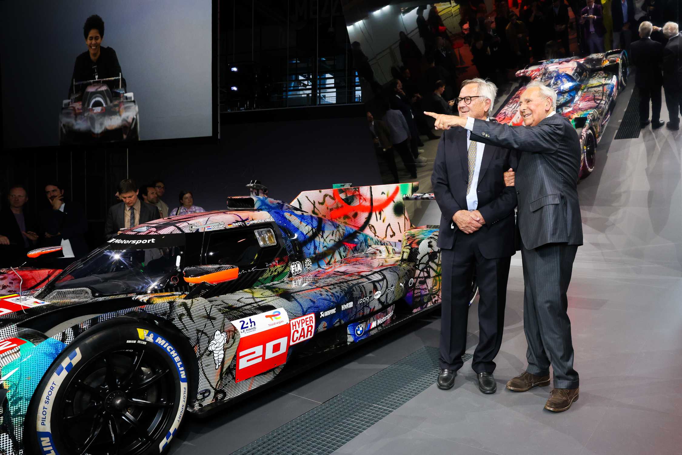 Weltpremiere des BMW Art Car #20 von Julie Mehretu, Centre Pompidou, Paris, 21. Mai 2024. Initiatoren der BMW Art Car Collection Jochen Neerpasch (ehemaliger Leiter der BMW Motorsport GmbH) und Hervé Poulain (ehemaliger französischer Motorsport-Rennfahrer). (05/2024)