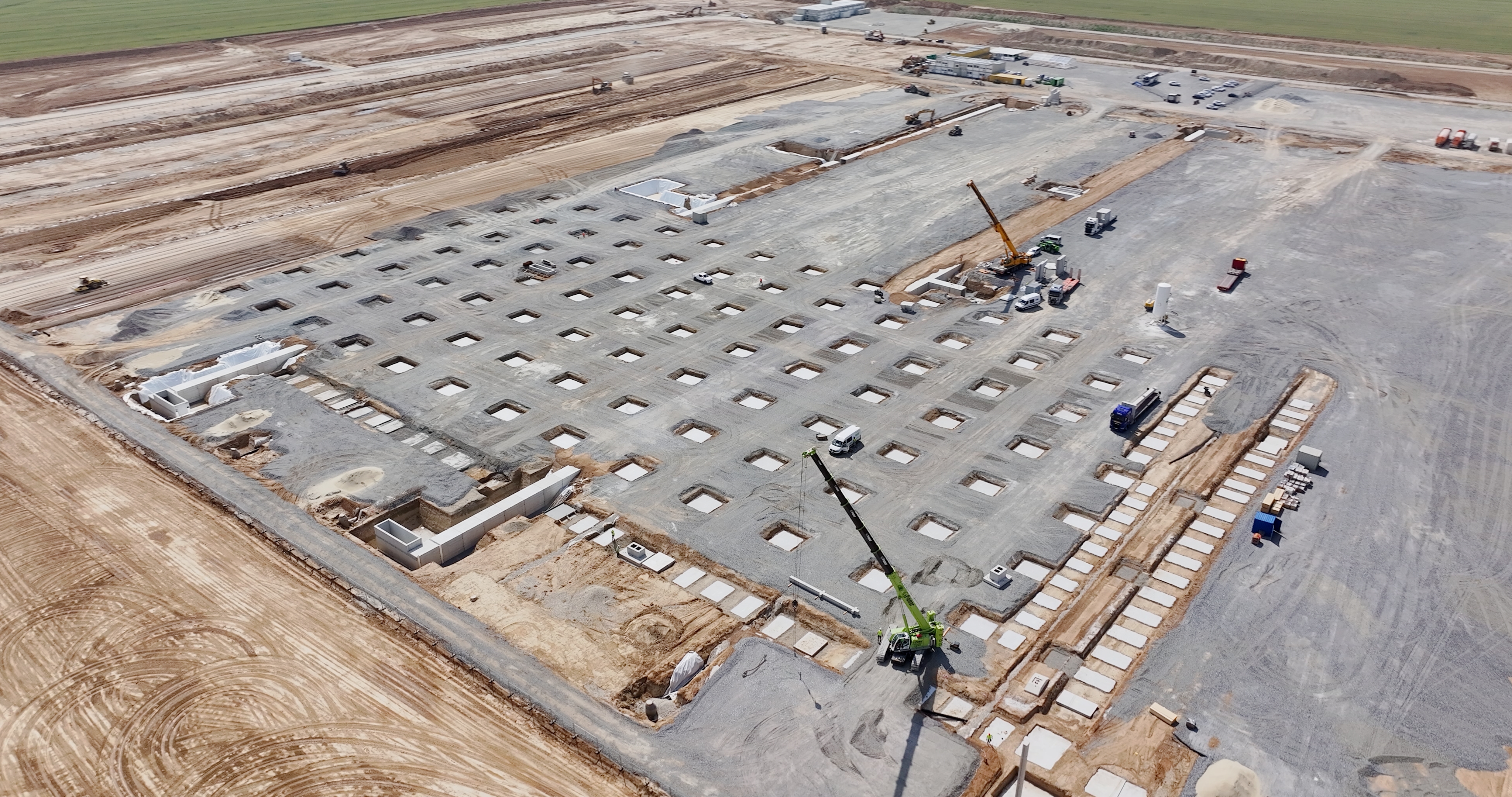 Luftaufnahme der Baustelle des Montagewerks für Hochvoltbatterien Irlbach-Straßkirchen. (10/2025)