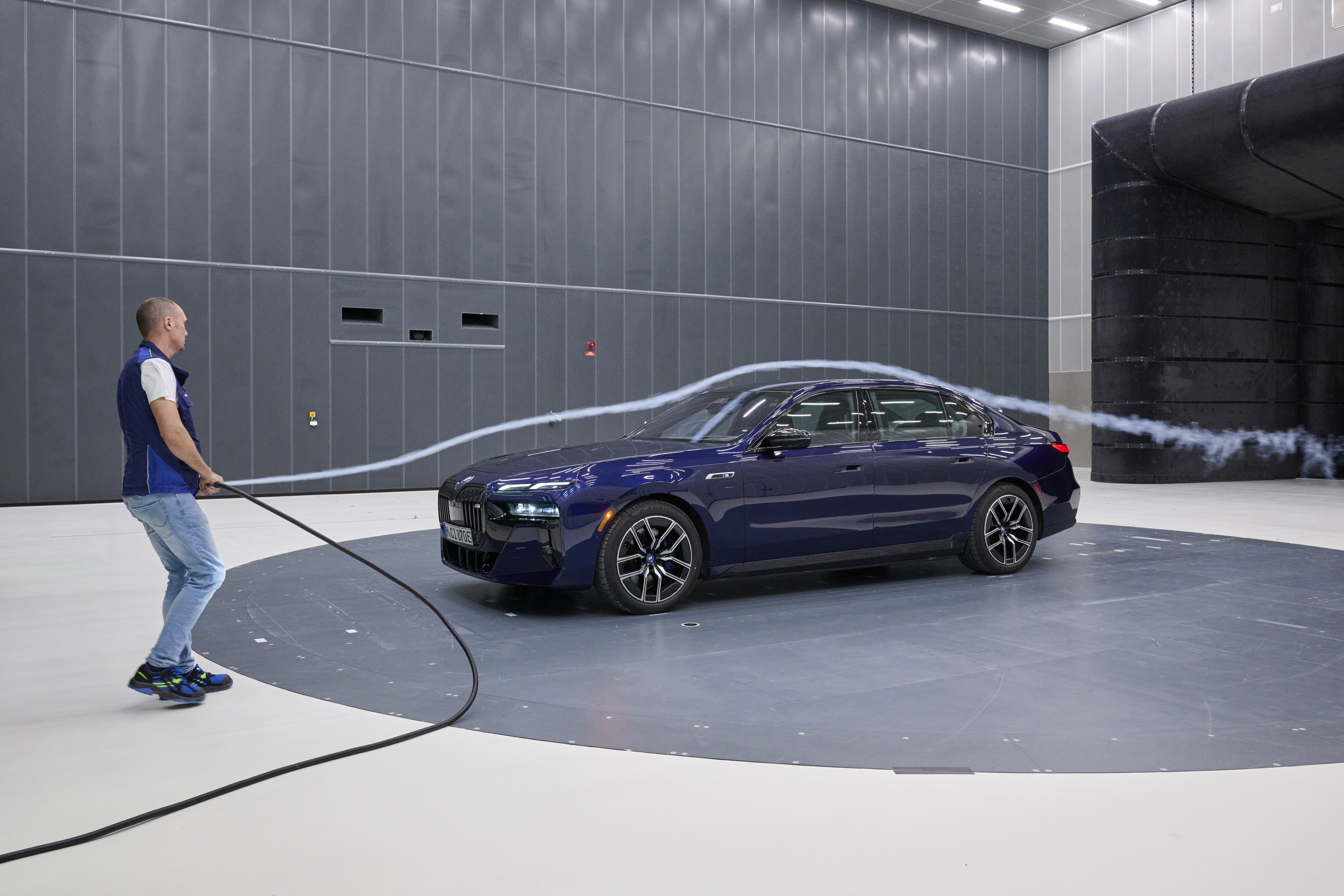 Arbeiten mit der Rauchlanze im Aeroakustik Windkanal der BMW Group (11/2024)