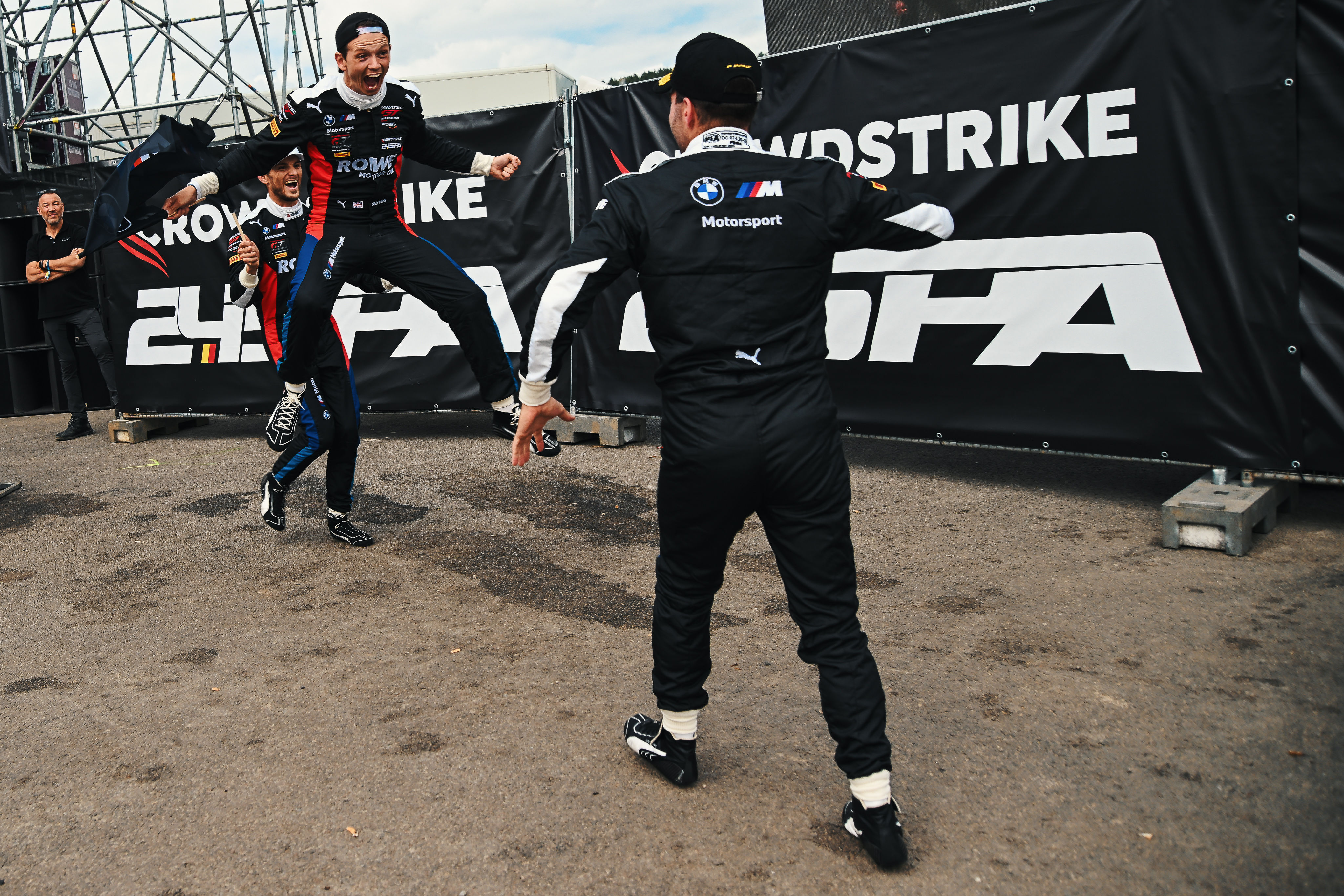 Spa-Francorchamps (FRA), 29th June to 2nd July 2023. BMW M Motorsport, FANATEC GT World Challenge Europe powered by AWS, Endurance Cup, Intercontinental GT Challenge, 24 Hours of Spa-Francorchamps. ROWE Racing, #98 BMW M4 GT3, Philipp Eng (AUT), Marco Wittmann (GER), Nick Yelloly (GBR), podium.