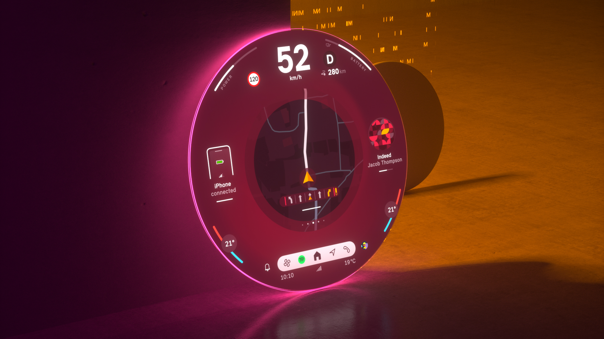 MINI Experience Mode Vivid - home menu. *The screen designs shown may differ in production vehicles. Vehicle-related values are exemplary and may differ in production vehicles. Feature availability depends on vehicle model, optional equipment and country.