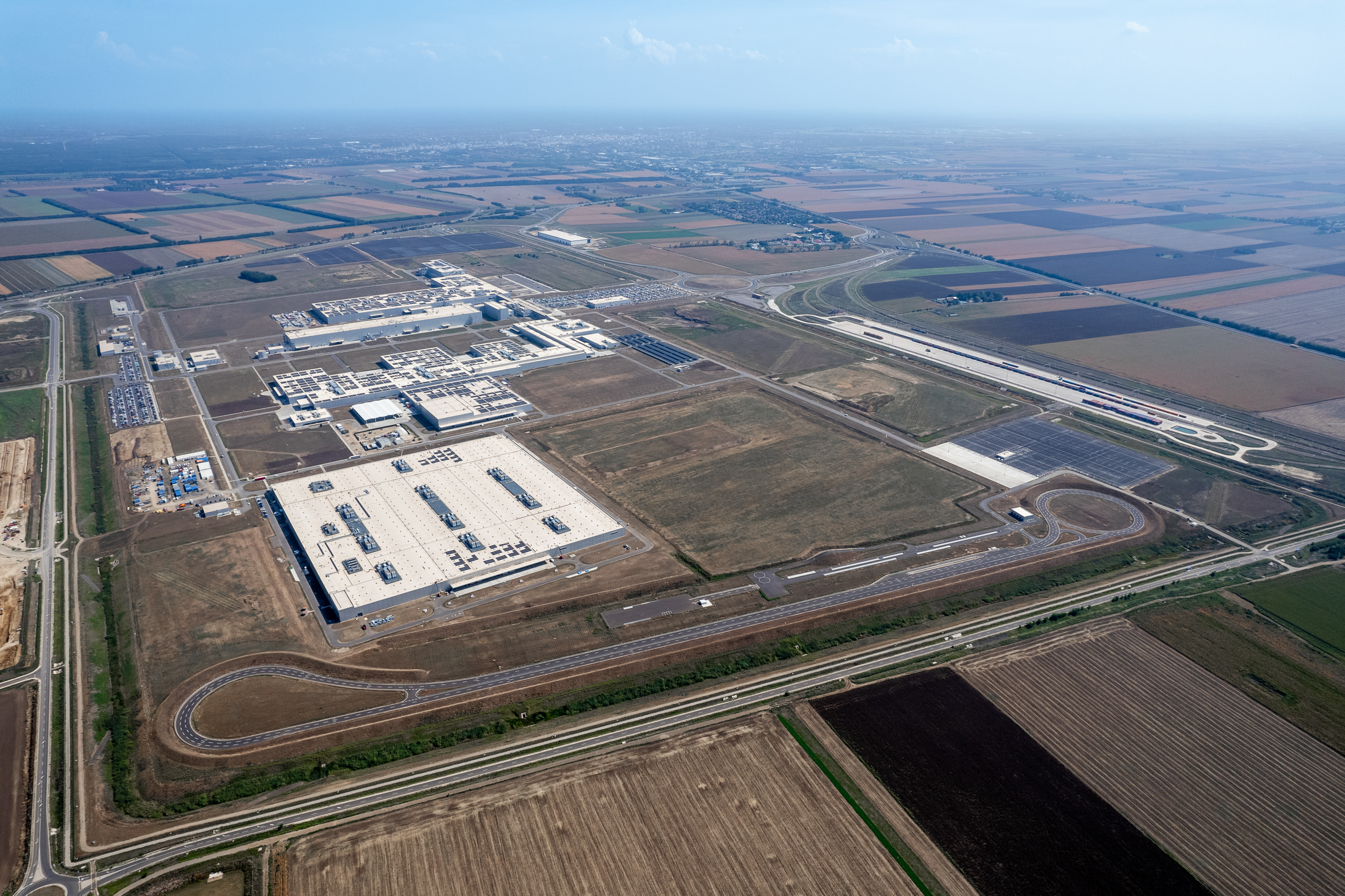 Aerial view of the high-voltage battery assembly plant in Irlbach-Straßkirchen, with the Energy Center and the Fire Station in the foreground. (10/2025)