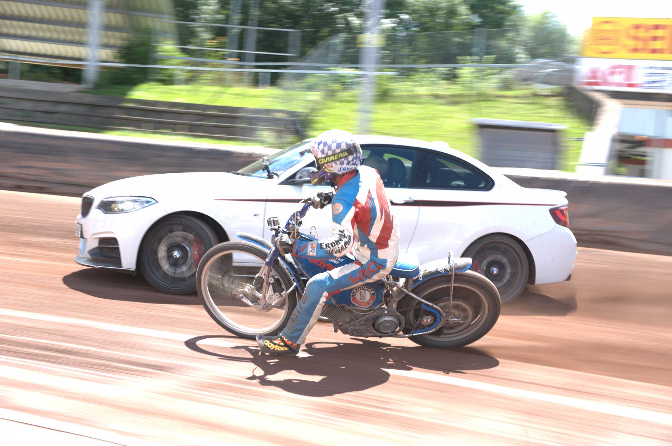 It was the first time a representative of a leading German car magazine took a BMW M235i with M Performance Parts onto the almost 400-metre-long track to compete in a drifting contest against BMW motorcycle dealer and four-times dirt-track world champion Karl Maier on a speedway bike.