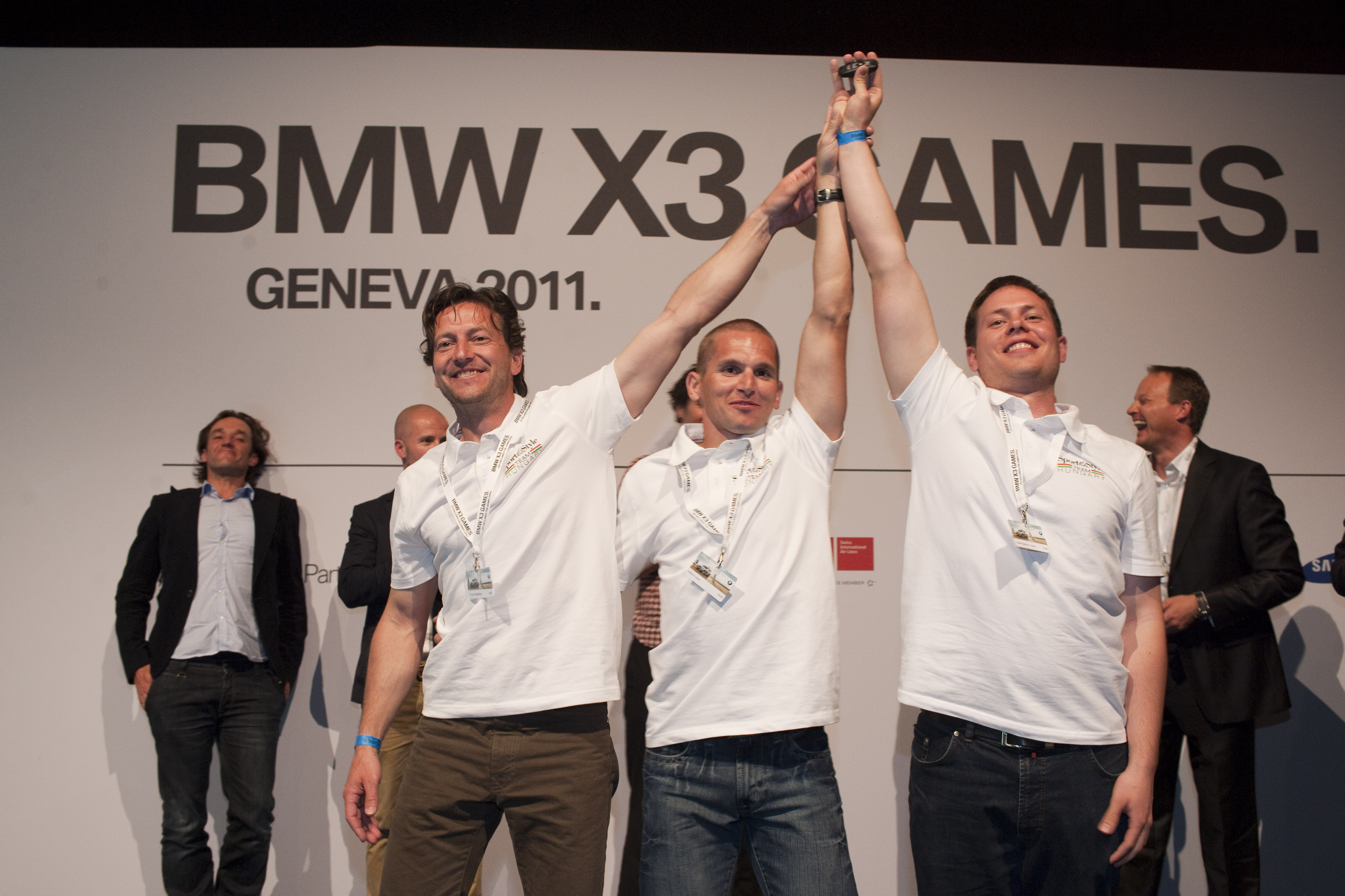 BMW X3 Games - Award Ceremony: Moderator Chris Brow, the winners Szabolcs Majthényi, Miklós Vatai and Ádám Baksay-Szabó, and Andreas-Christoph Hofmann, Head of Marketing Communications at BMW (04/2011)