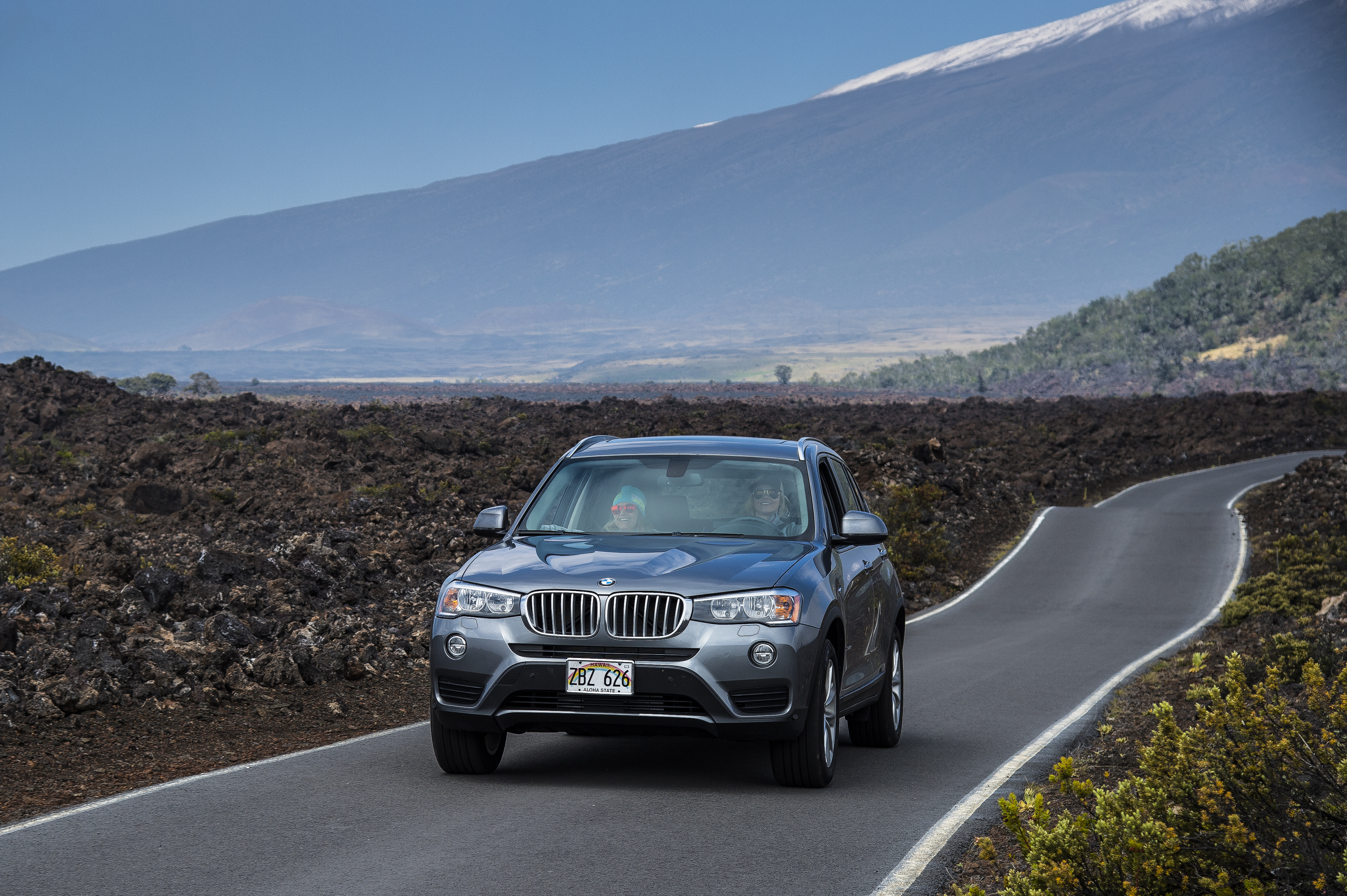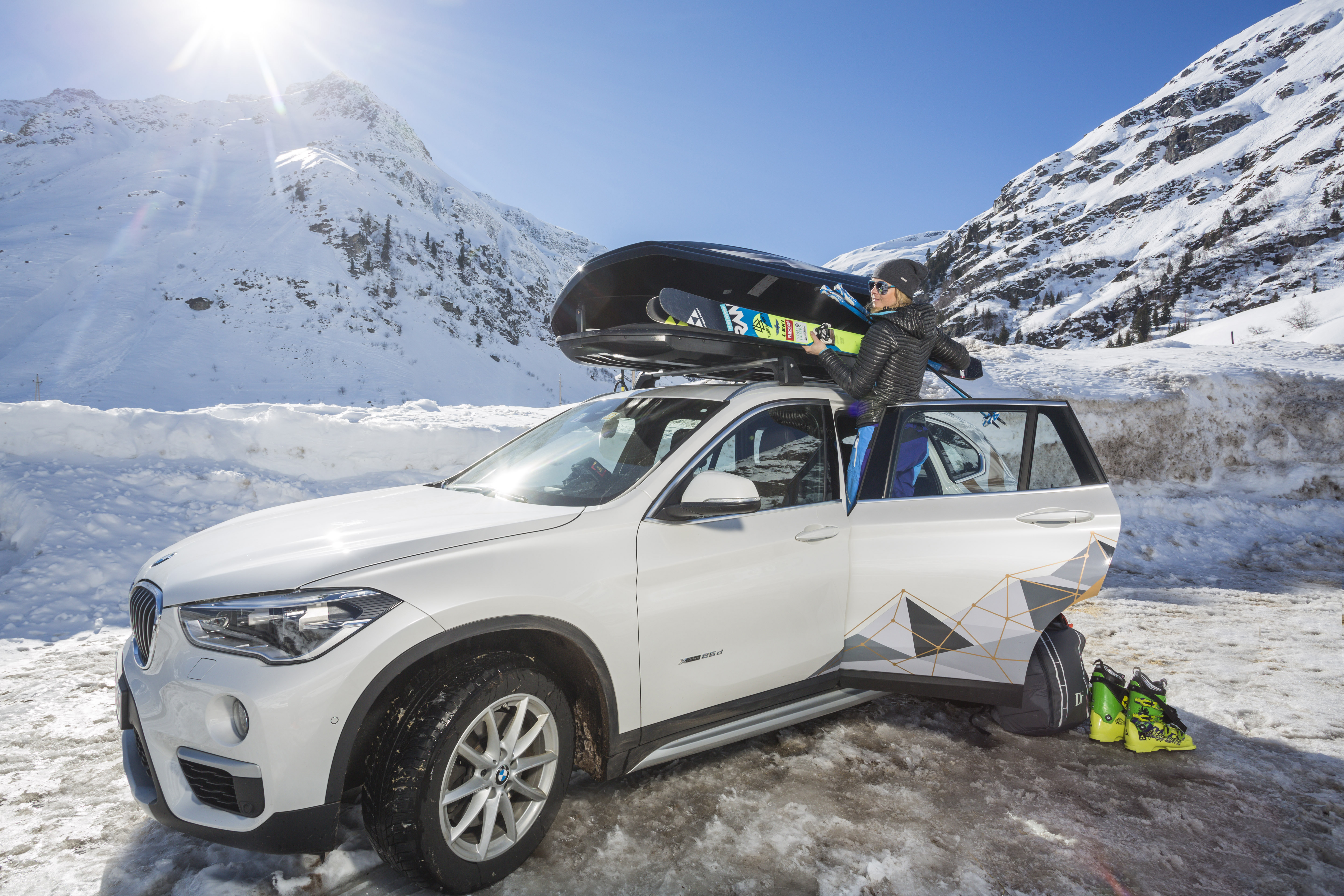 Sandra Lahnsteiner and Carissa Moore with the new BMW X1 in the freeride film project "Shades of Winter: Between". (© Chris Laistler, 09/2016)