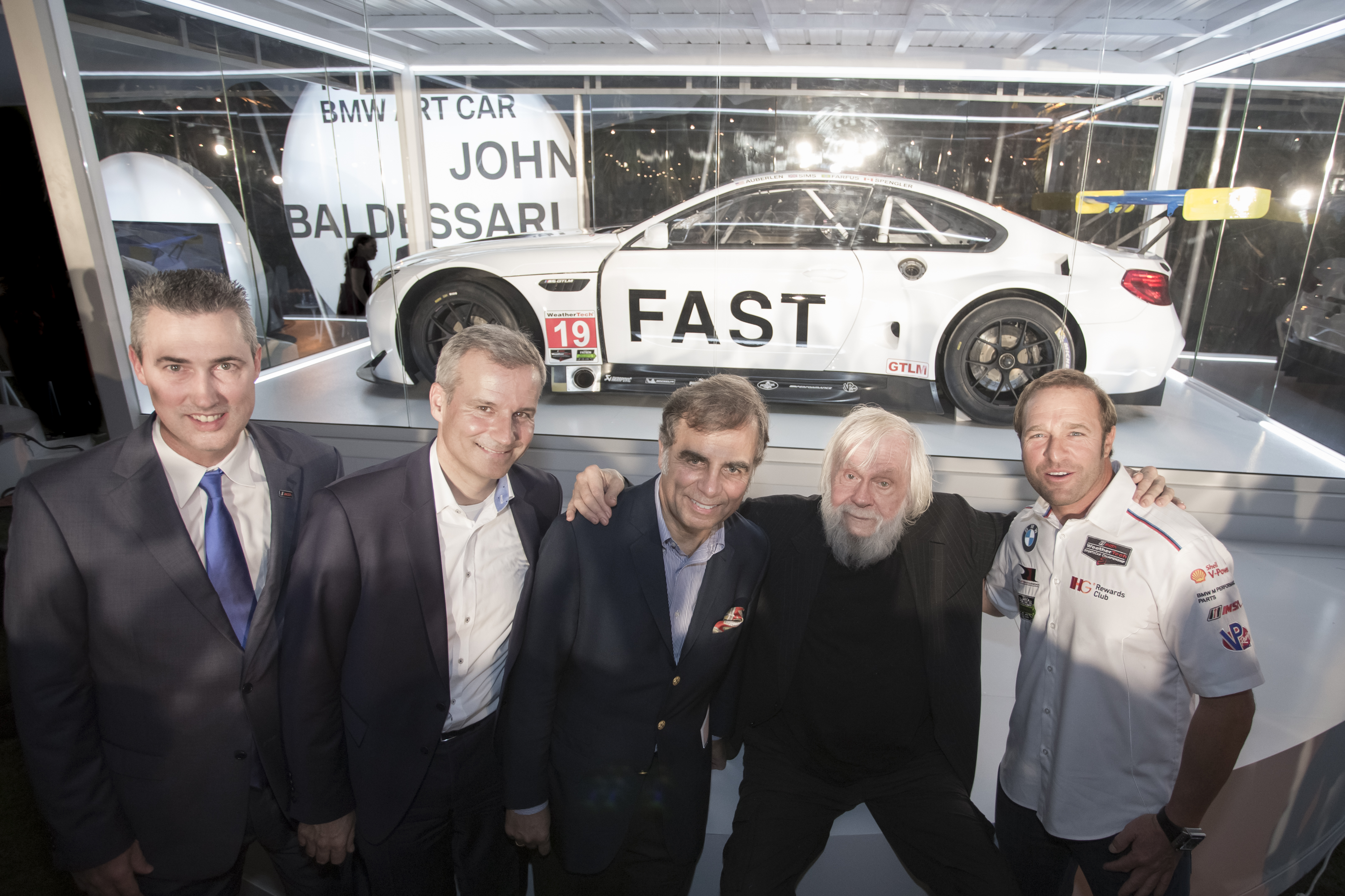 Ed Bennett (CEO, IMSA & EVP, Chief Administrative Officer, NASCAR), Jens Marquardt (BMW Motorsport Director), Ludwig Willisch (CEO and President, BMW of North America), John Baldessari, and Bill Auberlen (race driver) at the world premiere of the 19th BMW Art Car at Art Basel in Miami Beach on Wednesday, November 30, 2016. Photography by Chris Tedesco. (c) BMW AG. 12/2016