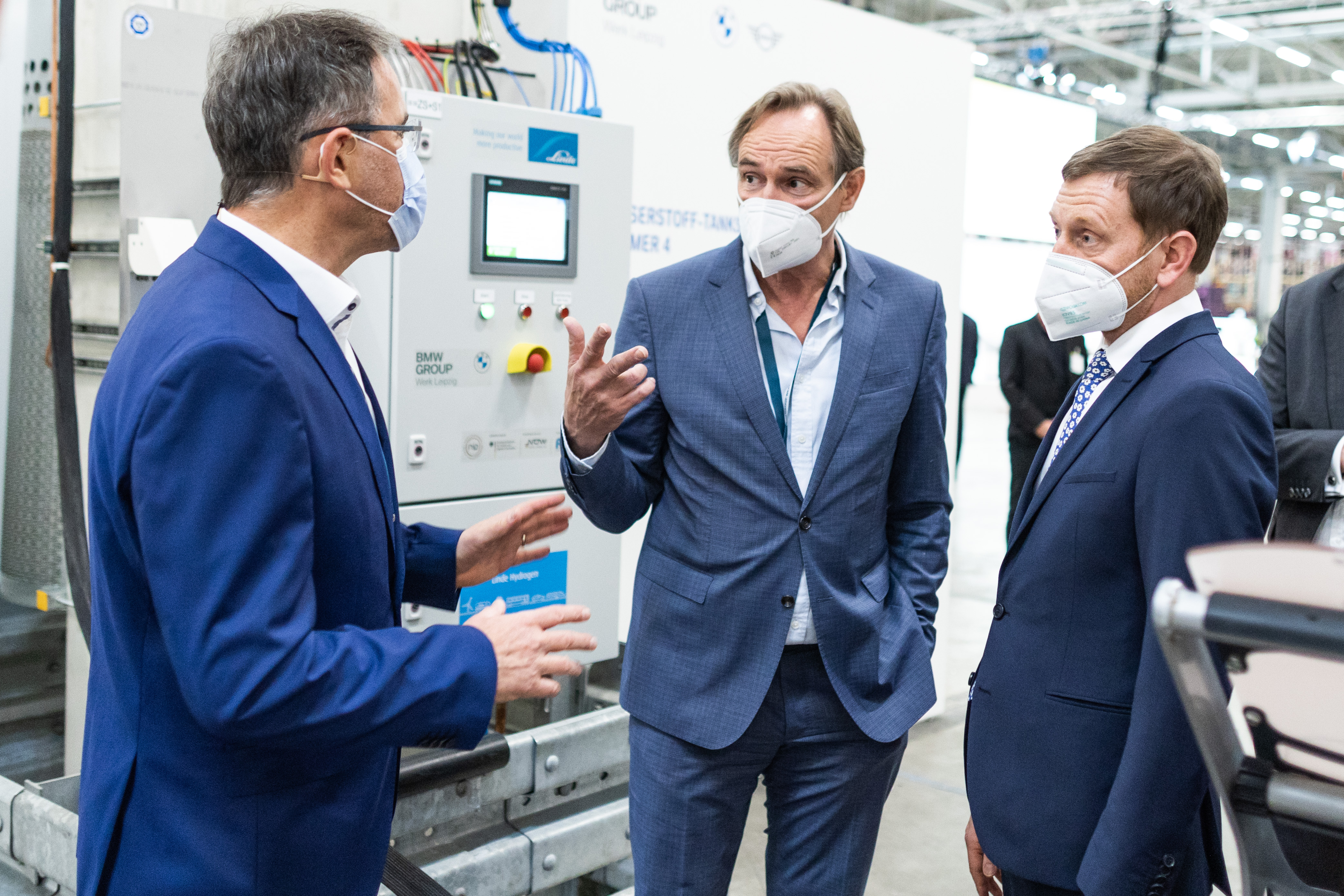 Discussing the challenges and opportunities of hydrogen at the inauguration of BMW Group Plant Leipzig’s fourth hydrogen filling station (from left to right): Hans-Peter Kemser, Director of BMW Group Plant Leipzig, Burkhard Jung, Lord Mayor of Leipzig, and Michael Kretschmer, Minister President of Saxony. (05/2021)