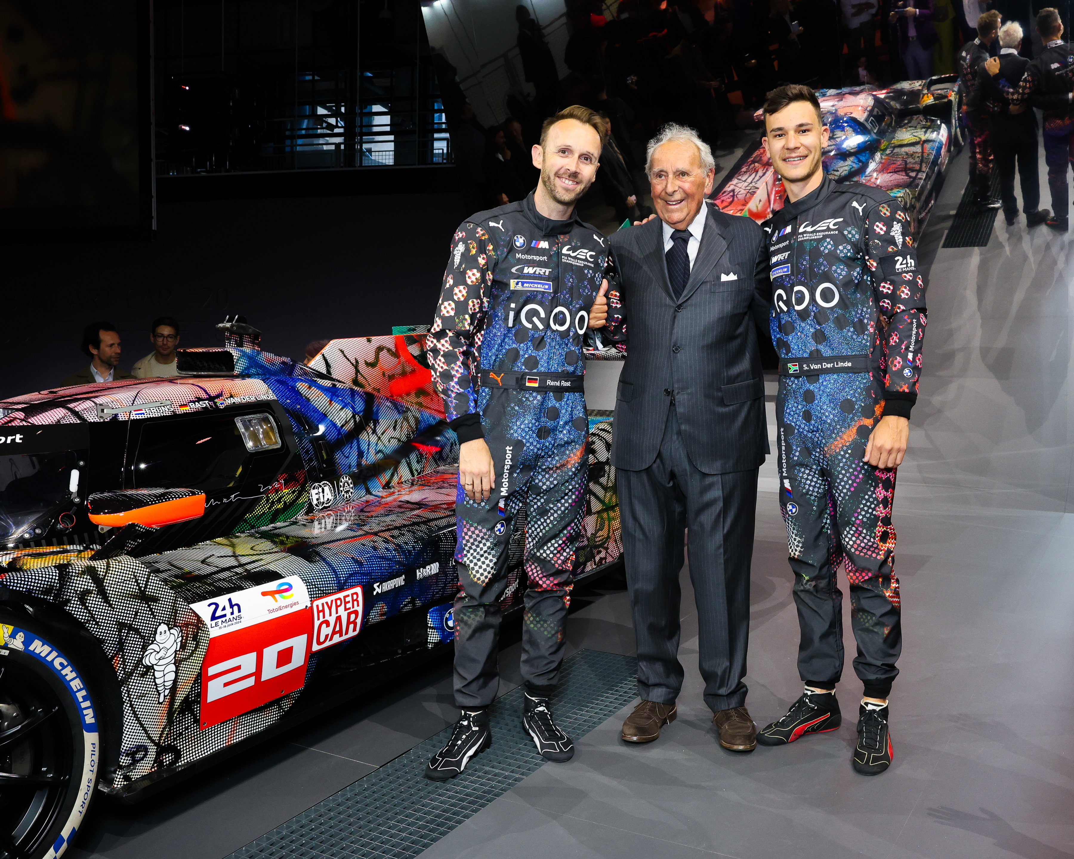 World premiere of the BMW Art Car #20 by Julie Mehretu, Centre Pompidou, Paris, May 21, 2024. F.l.t.r.: René Rast (BMW factory driver), Hervé Poulain (initiator of the BMW Art Car Collection, former French motorsports racing driver) and Sheldon Van Der Linde (BMW factory driver). (05/2024)