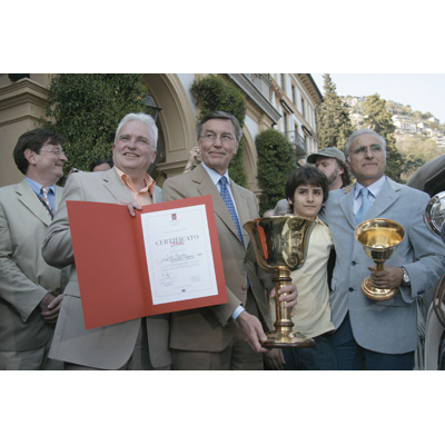 Concorso dEleganza Villa dEste 2006 - Villa dEste Design Award und BMW Group Design Award - By public Referendum at Villa dEste - Alfa Romeo 8C Spider, 2005 - Entrant: Wolfgang Egger (I) - f.l.t.r.: Urs Ramseier, Wolfgang Egger, Holger Lapp, Jean Marc Droulers (04/2006)