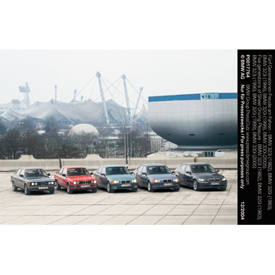 Five generations of Sheer Driving Pleasure - BMW 323i (1982), BMW 320i (1983), BMW 323i (1996), BMW 320i (1999), BMW 330i (2005) (01/2005)