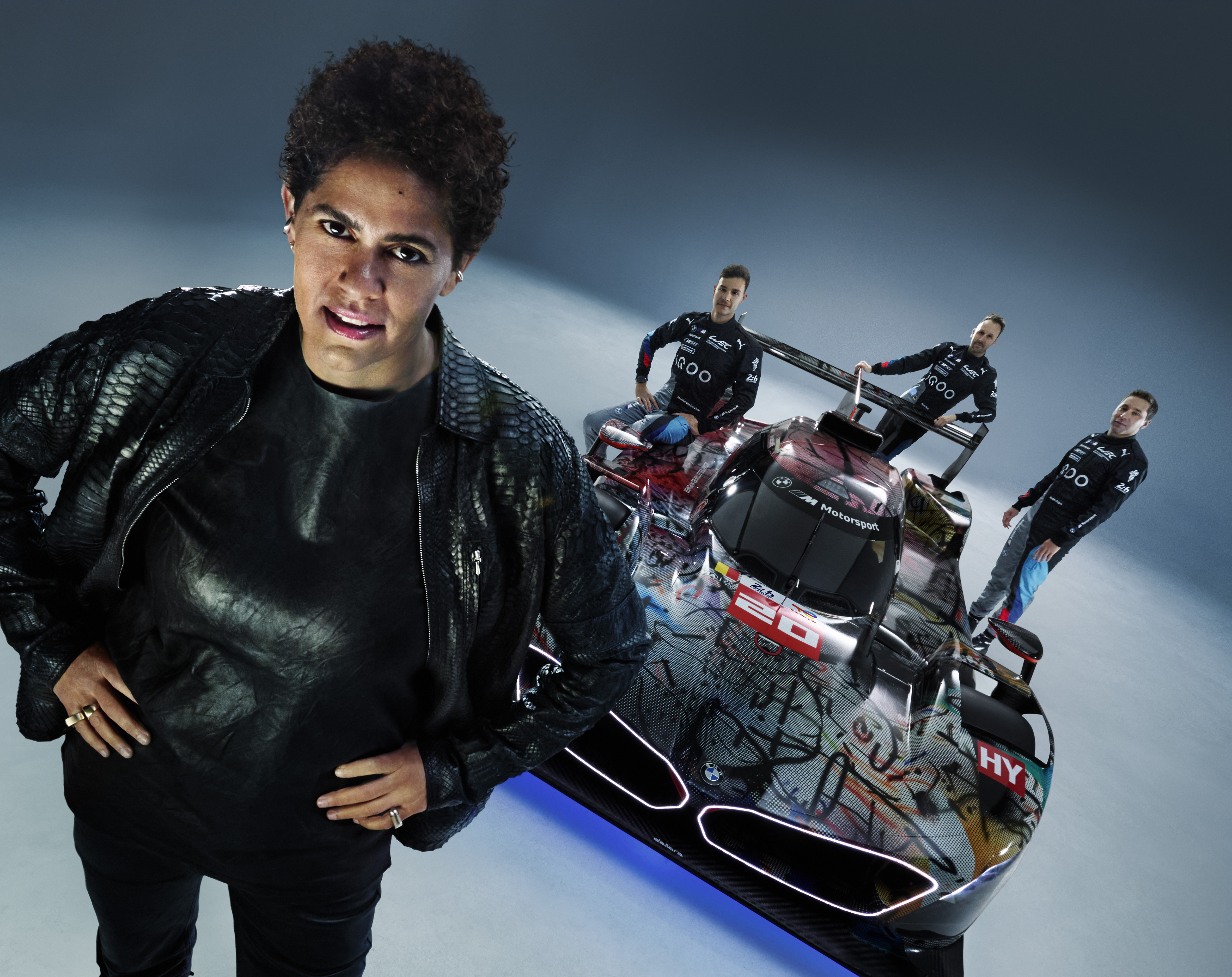 BMW Art Car #20 with artist Julie Mehretu and BMW factory drivers Sheldon van der Linde, Rene Rast and Robin Frijns (f.l.t.r.). ...