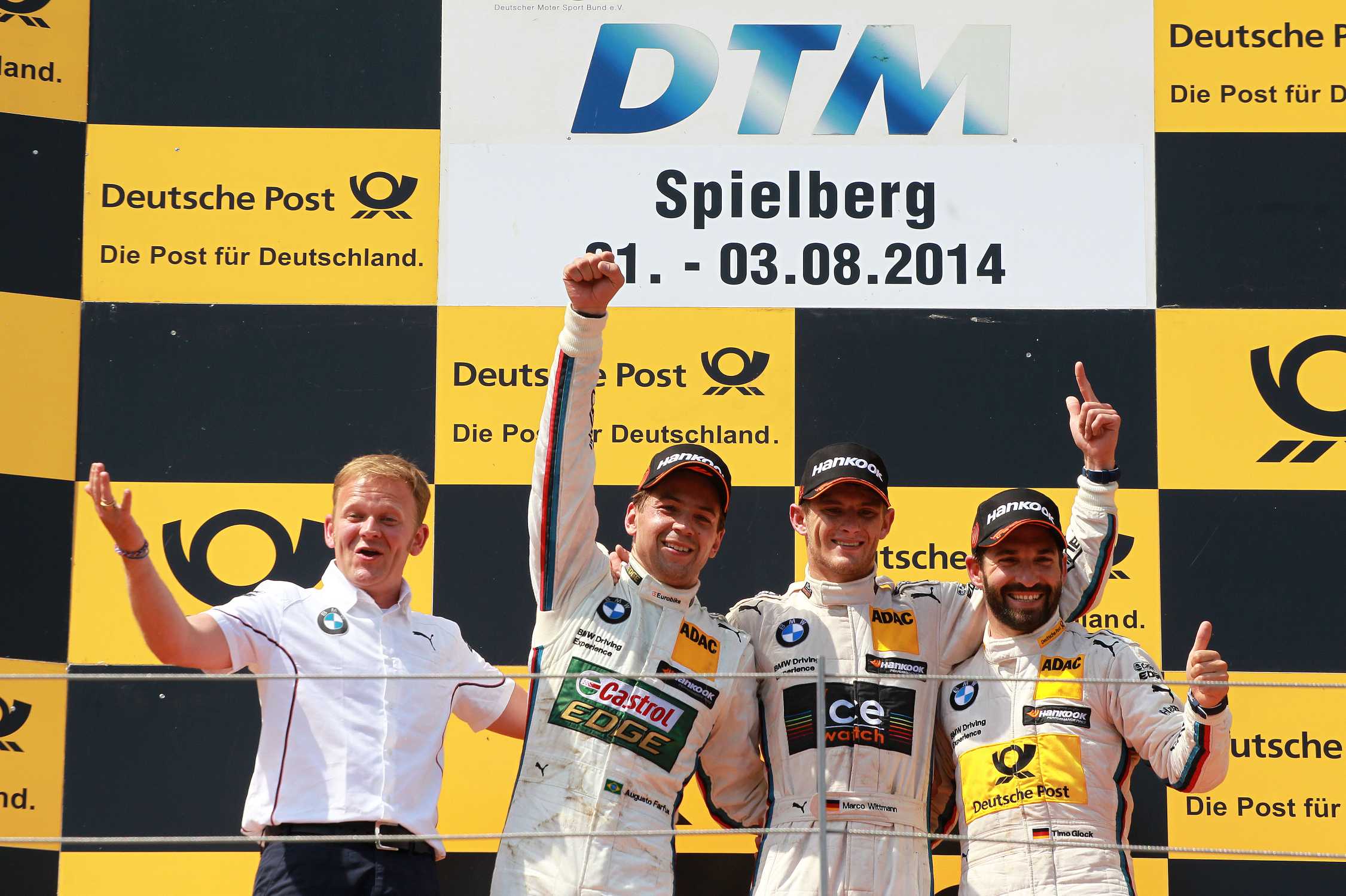 Spielberg (AT), 3. August 2014. Die BMW DTM-Teams haben beim sechsten Lauf auf dem Red Bull Ring (AT) den ersten Vierfachsieg seit dem DTM-Comeback 2012 gefeiert. Marco Wittmann (DE) triumphierte vor Augusto Farfus (BR), Timo Glock (DE) und Martin Tomczyk (DE). Mit seinem dritten Saisonsieg baute Wittmann die Führung in der Fahrerwertung aus. In der Teamwertung liegt das BMW Team RMG an der Spitze. Auch bei den Herstellern übernahm BMW die erste Position. Lesen Sie hier, was BMW Motorsport Direktor Jens Marquardt, die Teamchefs sowie die acht Fahrer nach dem sechsten Lauf zu sagen hatten.