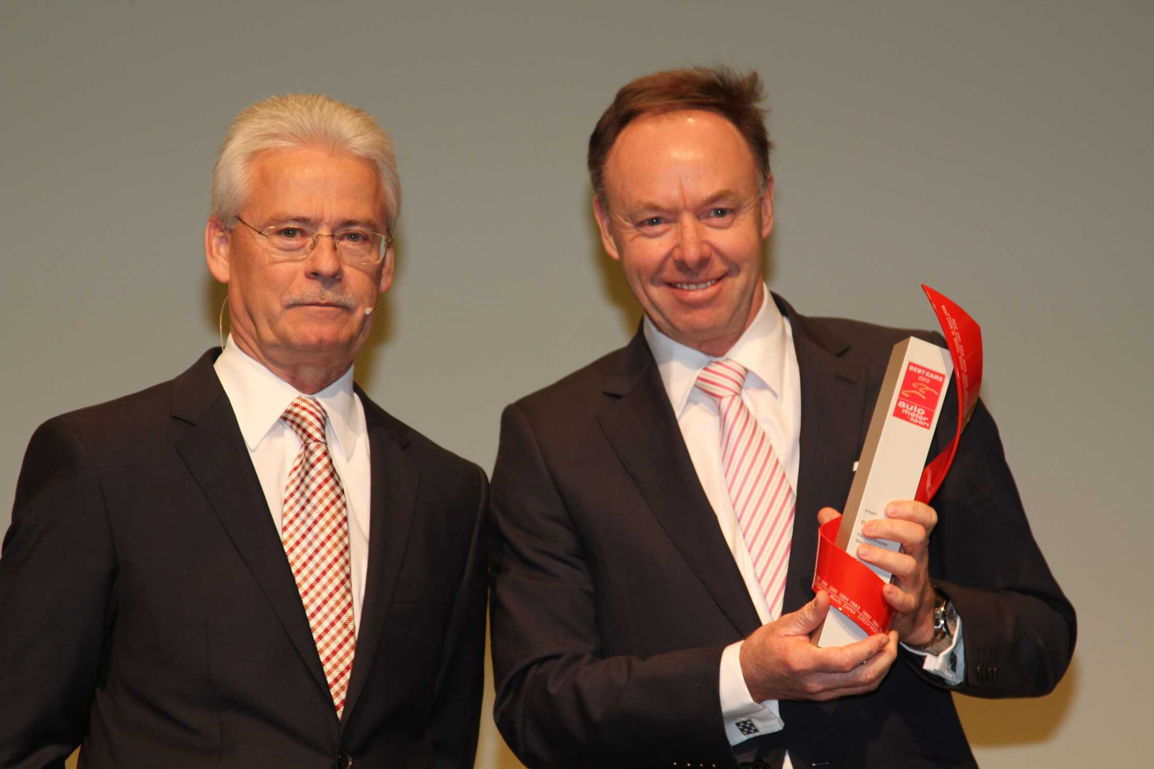 „Die besten Autos 2012“: Ian Robertson, Mitglied des Vorstands der BMW AG für Vertrieb und Marketing, nimmt die Ehrung für den ersten Platz in der „Kompaktklasse“ von Bernd Ostmann, Chefredakteur auto, motor und sport, entgegen (Foto: Motorpresse). - (01/2012)