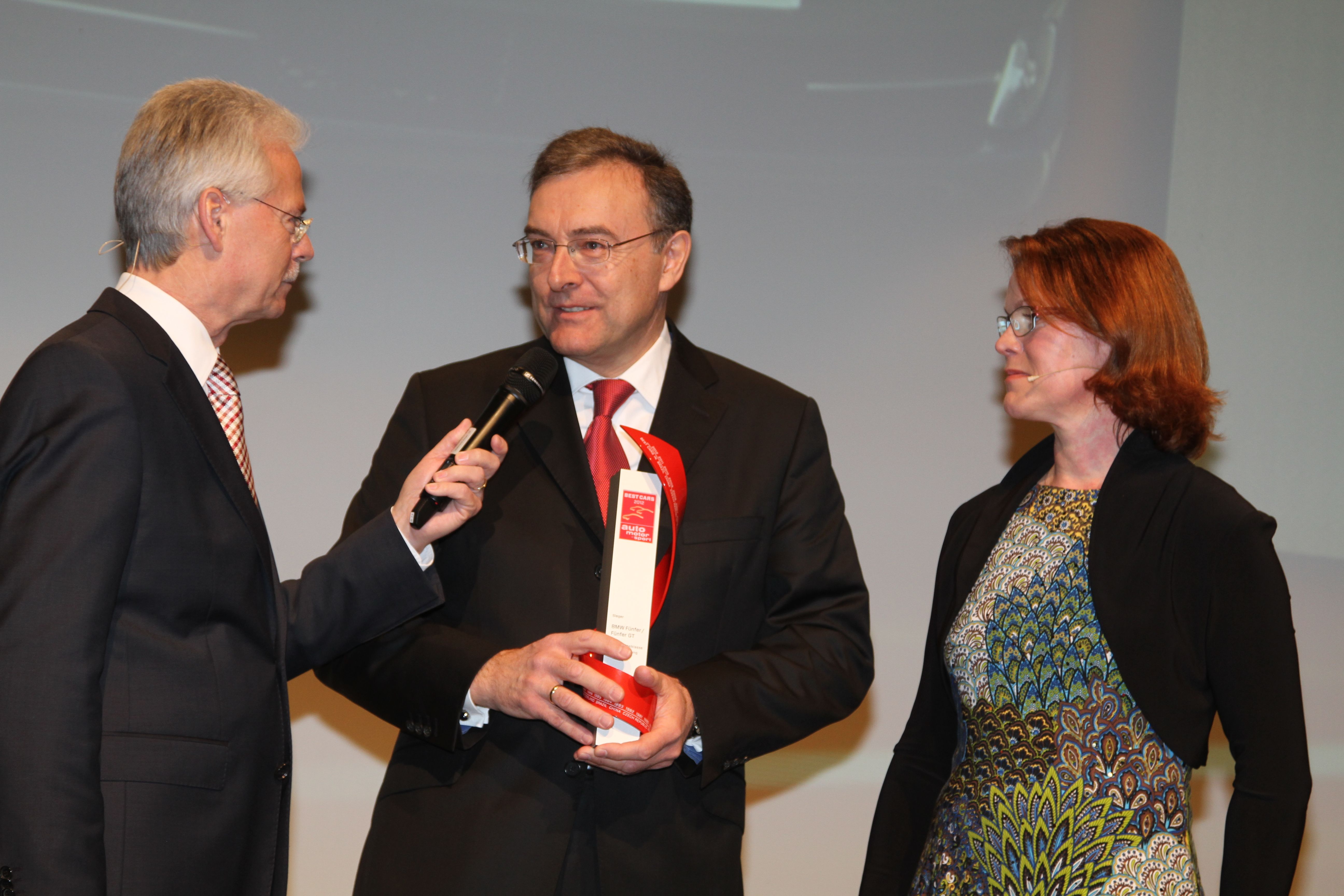 "Die besten Autos 2012“: Dr. Norbert Reithofer, Vorsitzender des Vorstands der BMW AG, erhält den ersten Preis in der Kategorie „Obere Mittelklasse“ von Bernd Ostmann und Birgit Priemer, Chefredaktion auto, motor und sport (Foto: Motorpresse). - (01/2012)