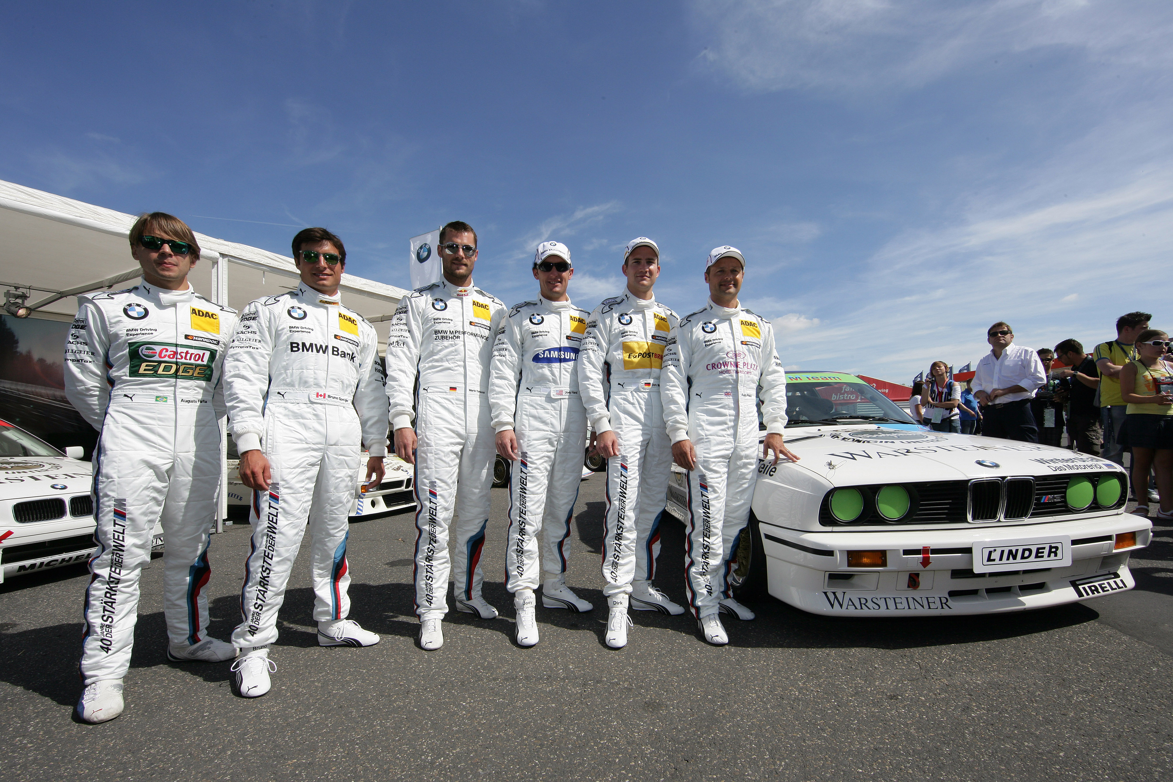 Nuerburgring (DE) 18th August 2012. BMW Motorsport, 40 Years of BMW M, Augusto Farfus (BR), Bruno Spengler (CA), Martin Tomczxk (DE), Joey Hand (US), Dirk Werner (DE) and Andy Piaulx (GB). This image is copyright free for editorial use © BMW AG (08/2012).