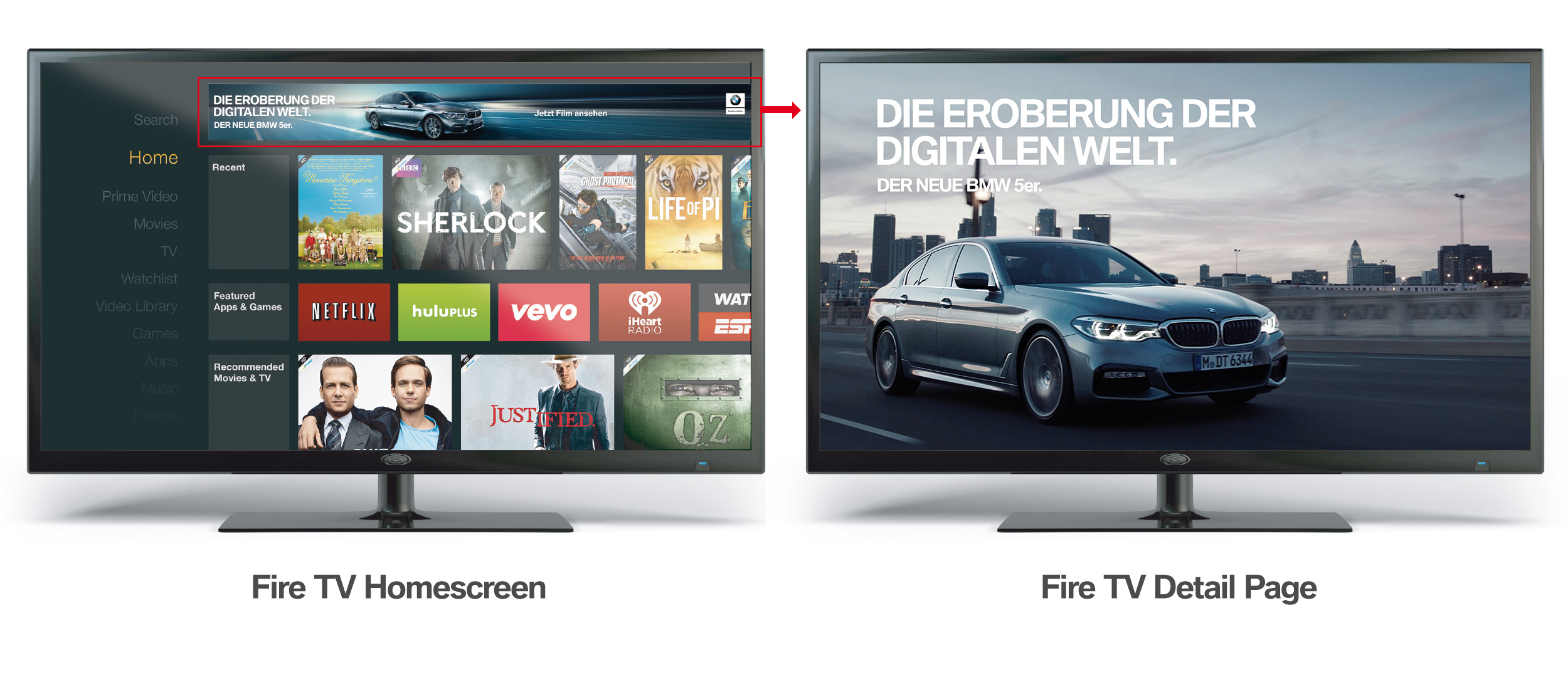 DIE EROBERUNG DER DIGITALEN WELT. Kampagne für die neue BMW 5er Limousine in Deutschland. Digitalanzeige in Amazon Fire TV.(01/2017)