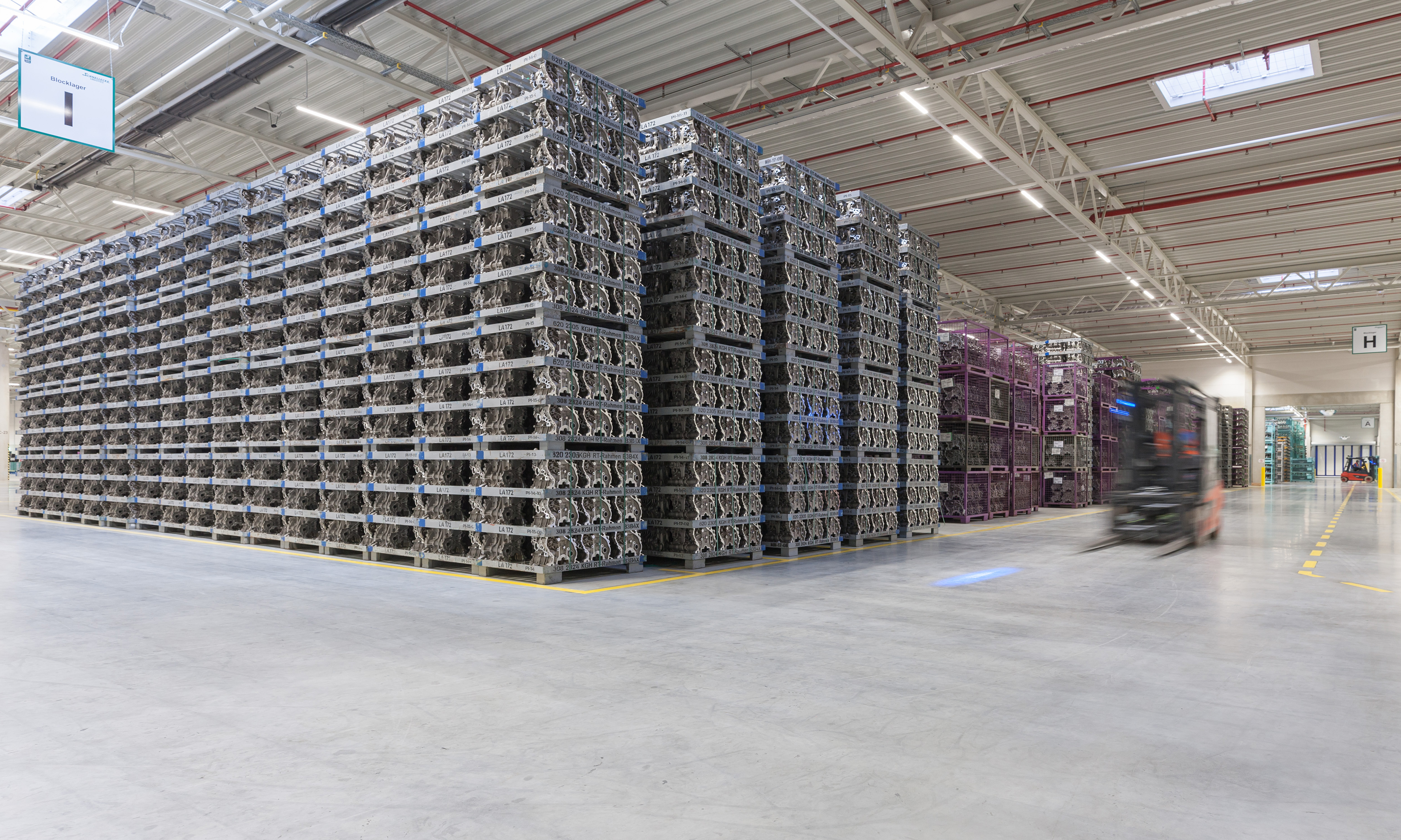 Versorgung der Komponentenfertigung im BMW Group Werk Landshut mit Produktionsmaterial aus dem Hochregallager des Versorgungszentrums.